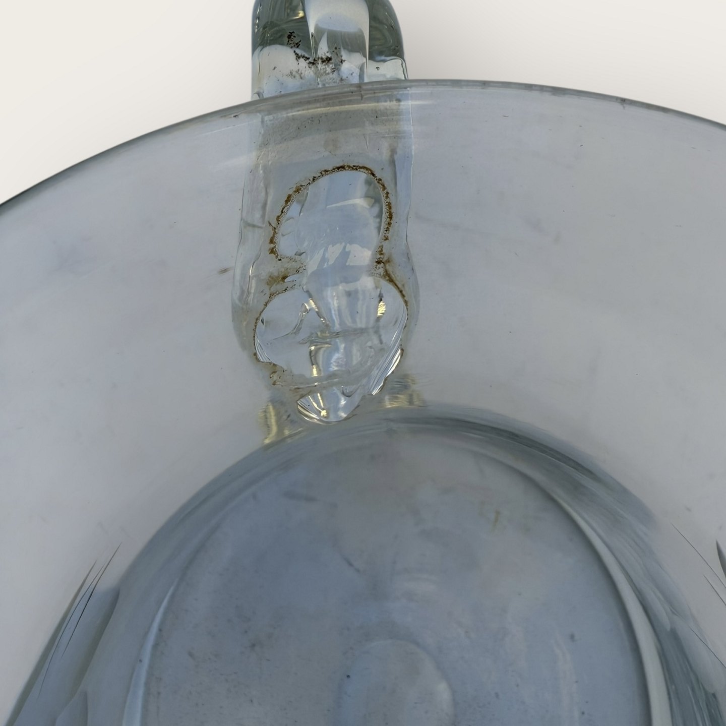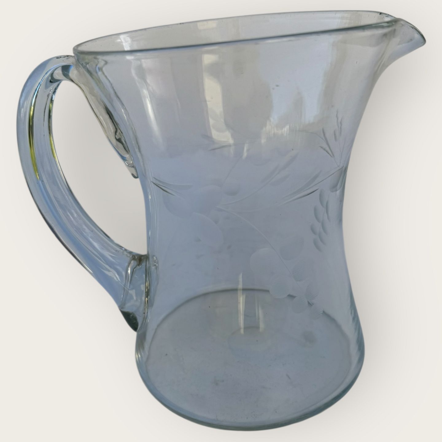 Beskrivelse: Bred glaskande med fine slibninger, Mål: HxBxD 17x19x13 cm, *Lidt kalk hvor hanken sidder fast på kanden(se foto) ellers pæn stand.