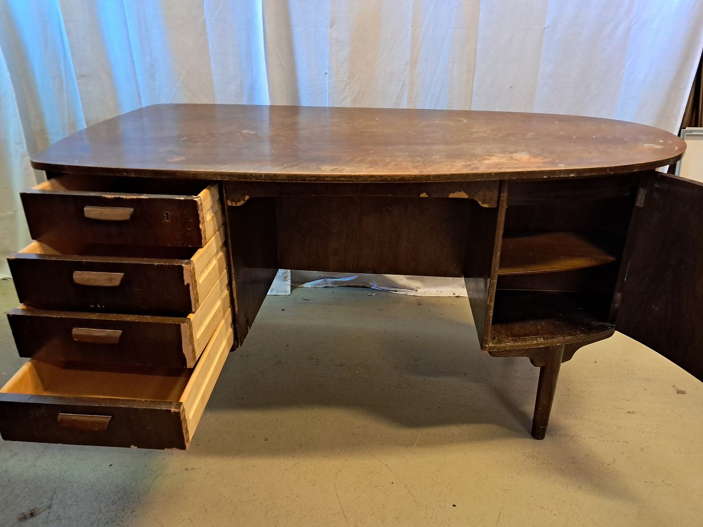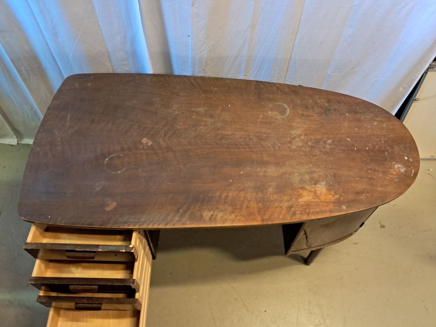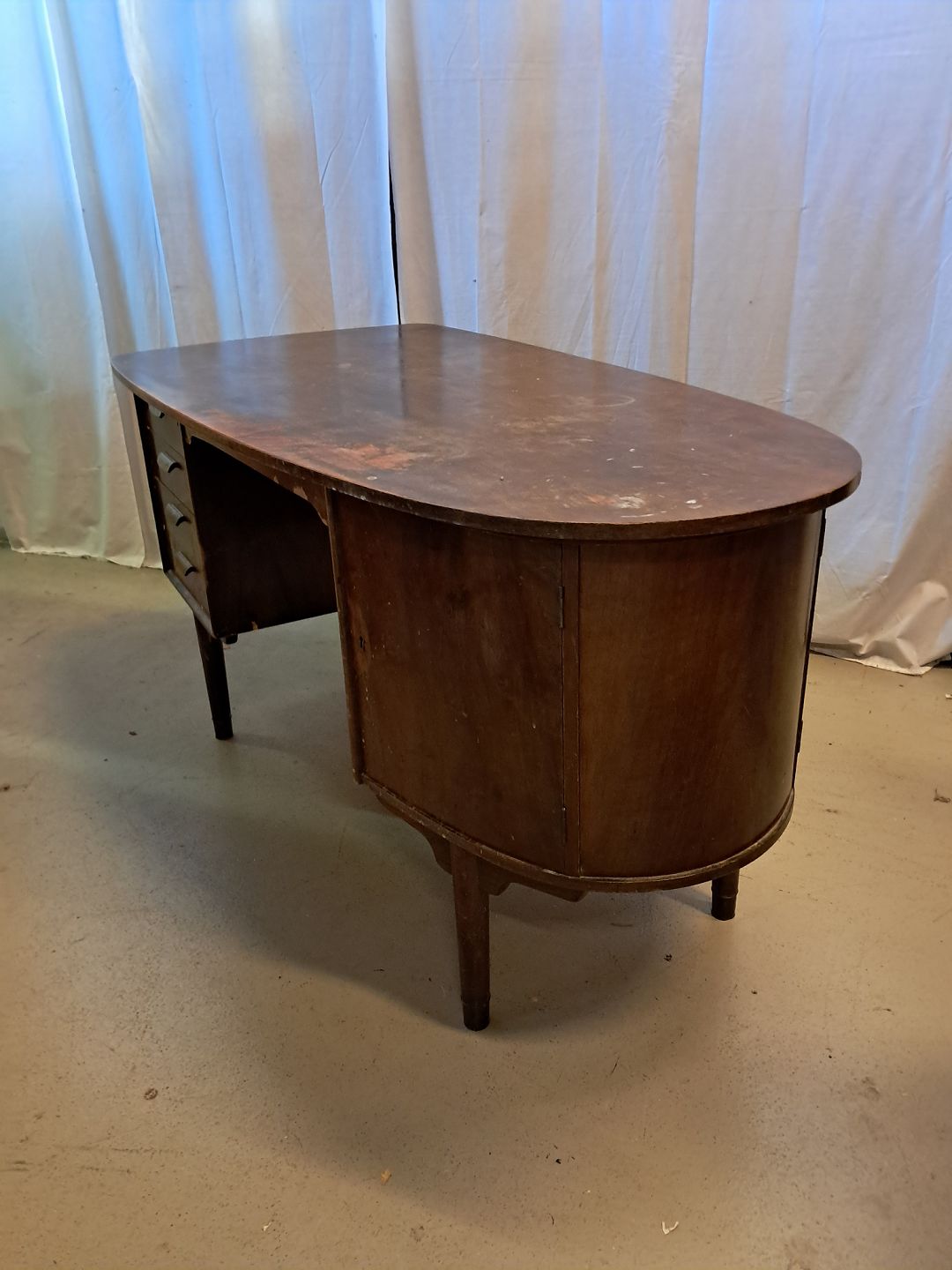 Beskrivelse: Skrivebord i fineret nødetræ, fra 1960erne.