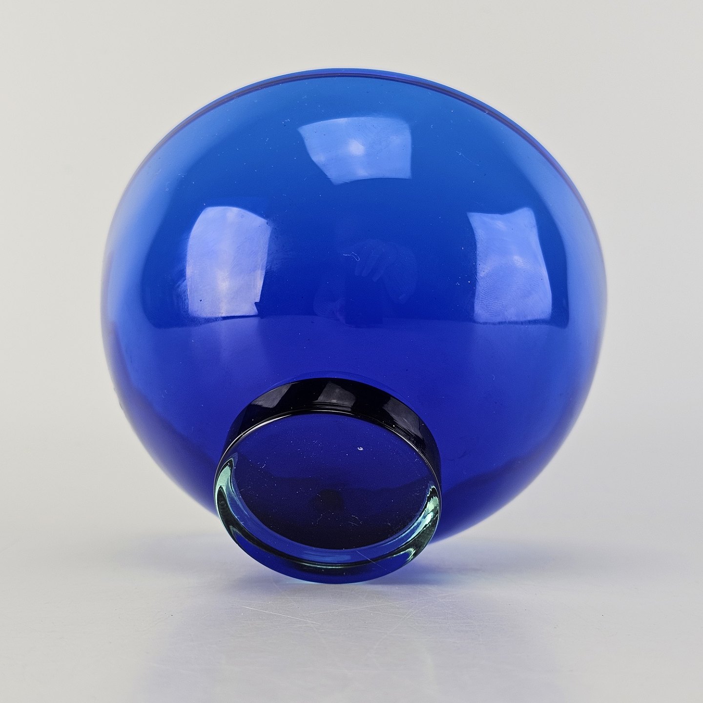 Beskrivelse: Harlekin skål i gennemsigtigt blåt glas med klart glas i bunden