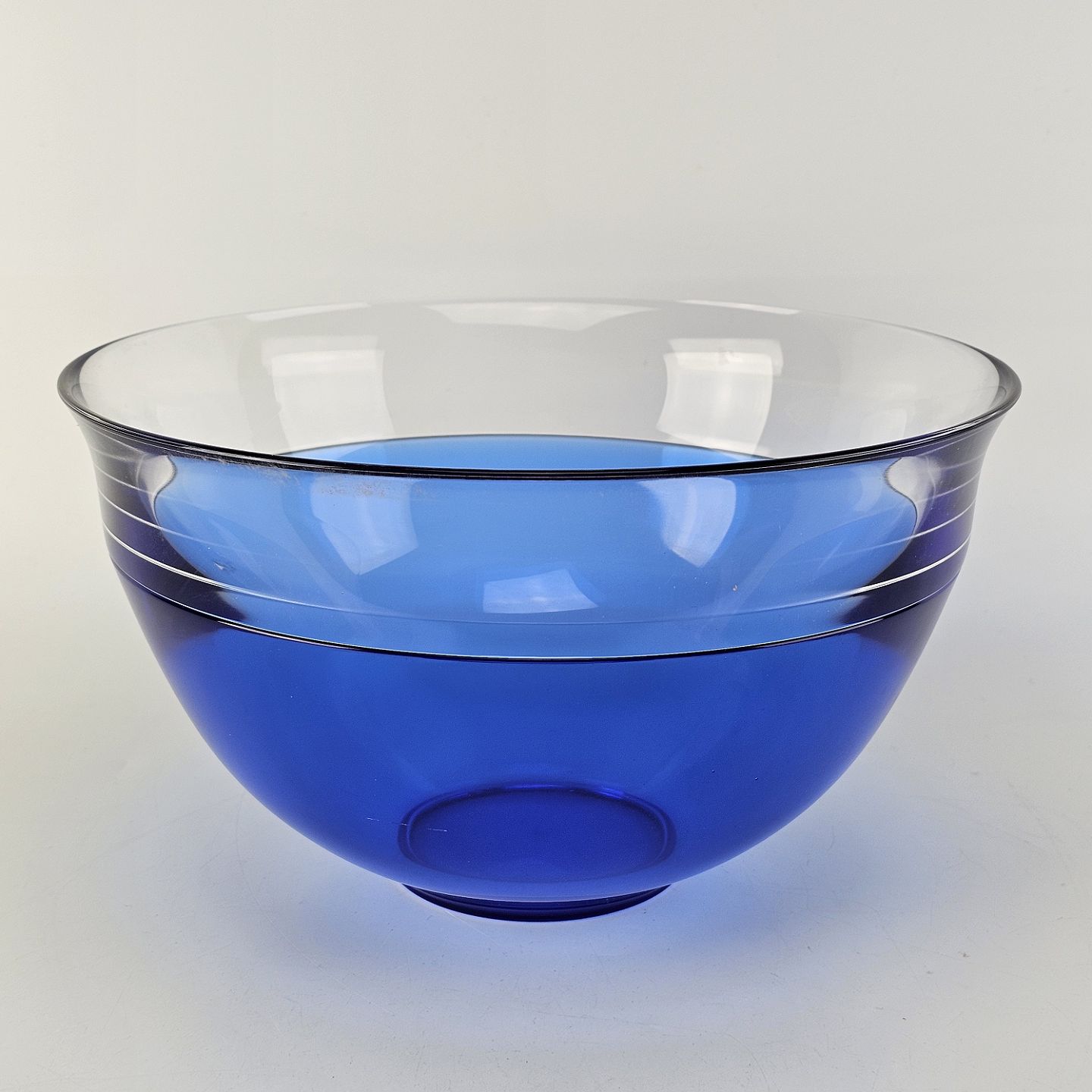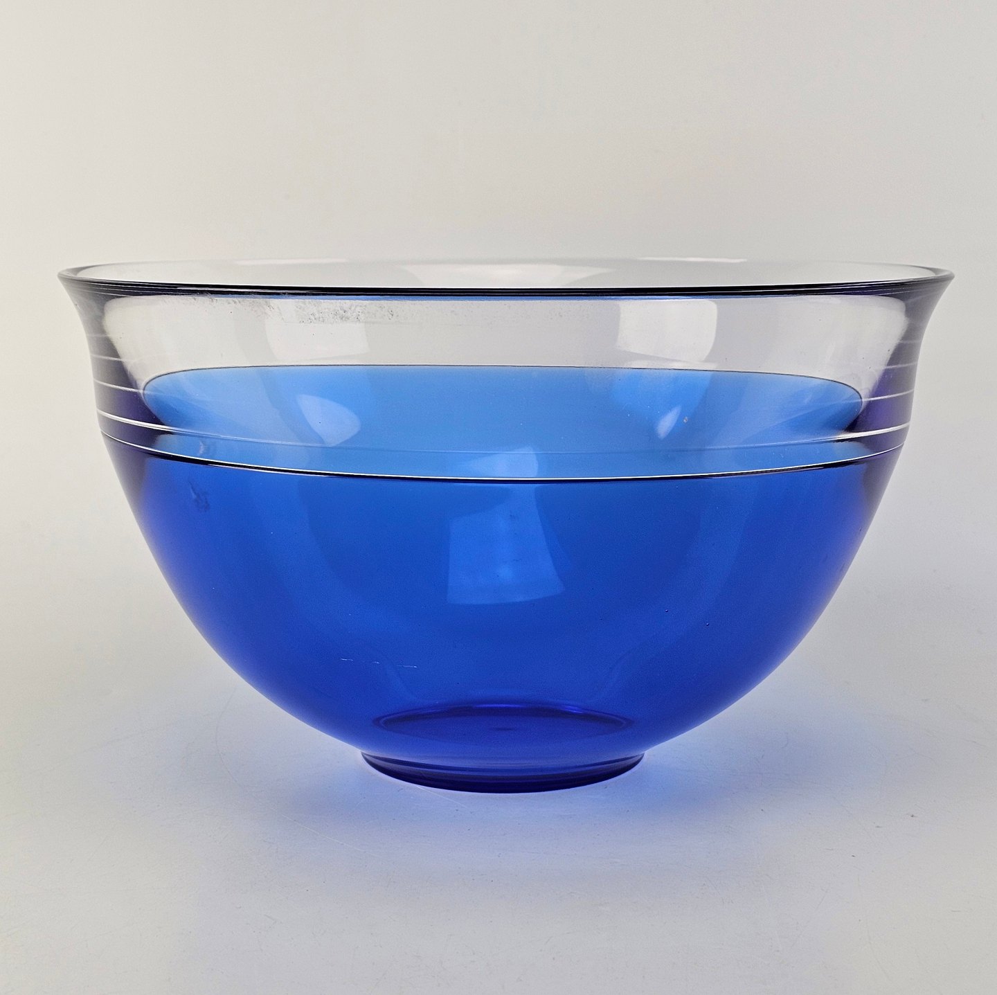 Beskrivelse: Neptunus skål i blåt glas med kant af klart glas