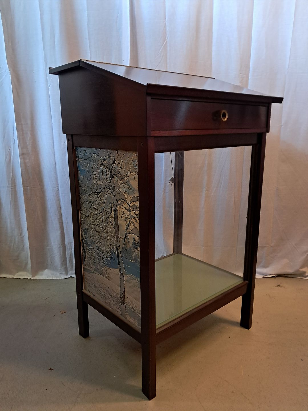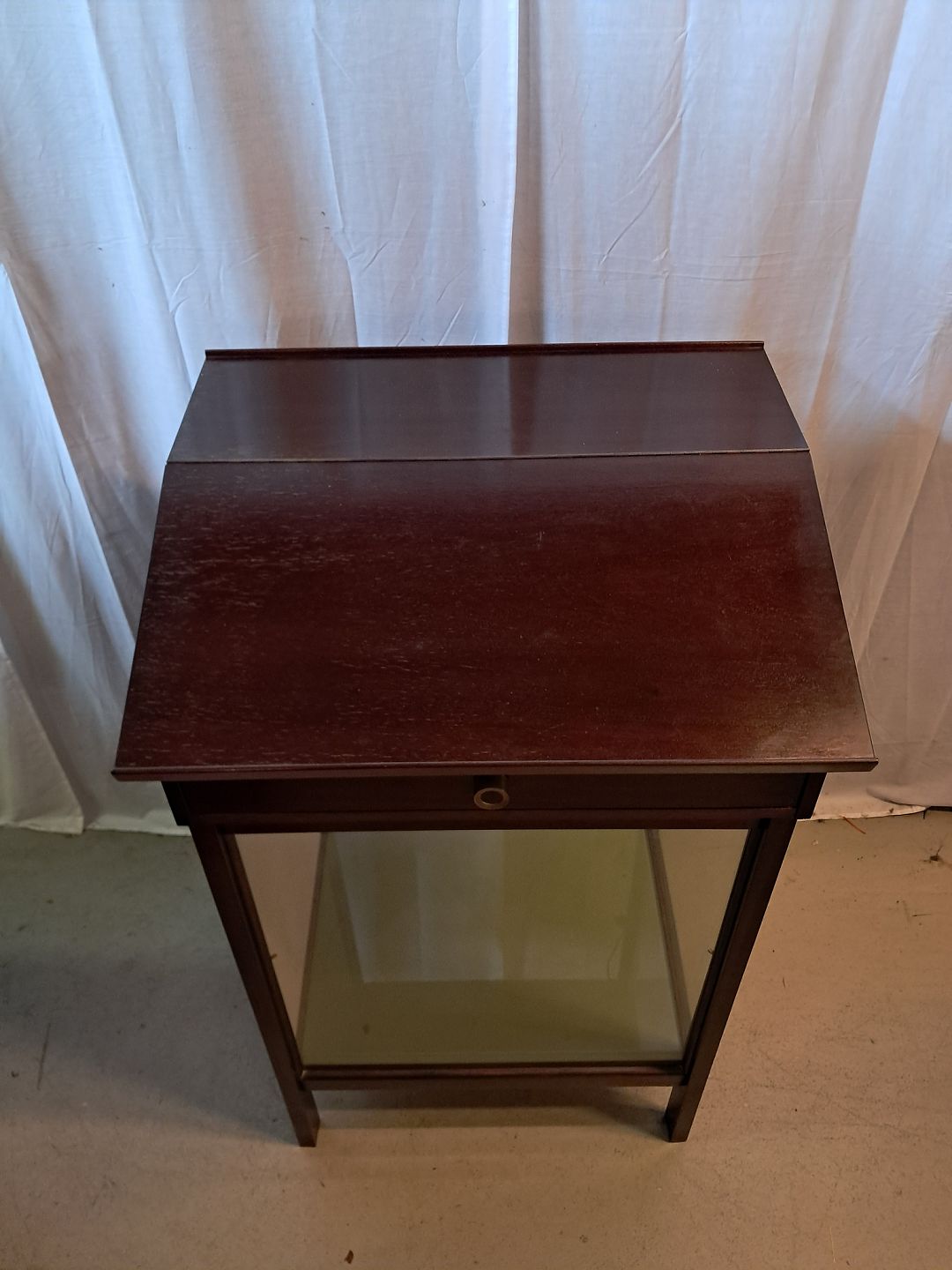 Beskrivelse: Skrivepult i fineret mahogni og glas, fra 1980erne.