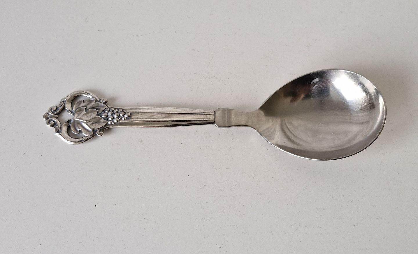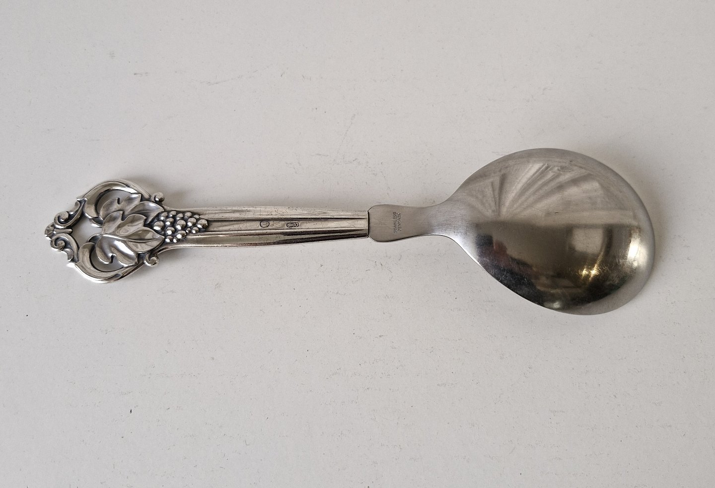 Description: Serving spoon in silver and steel decorated with bunch of grapes. Stamp: Cohr - the three towers.
