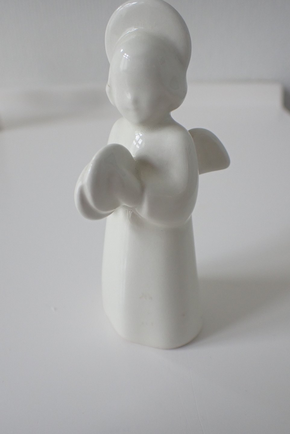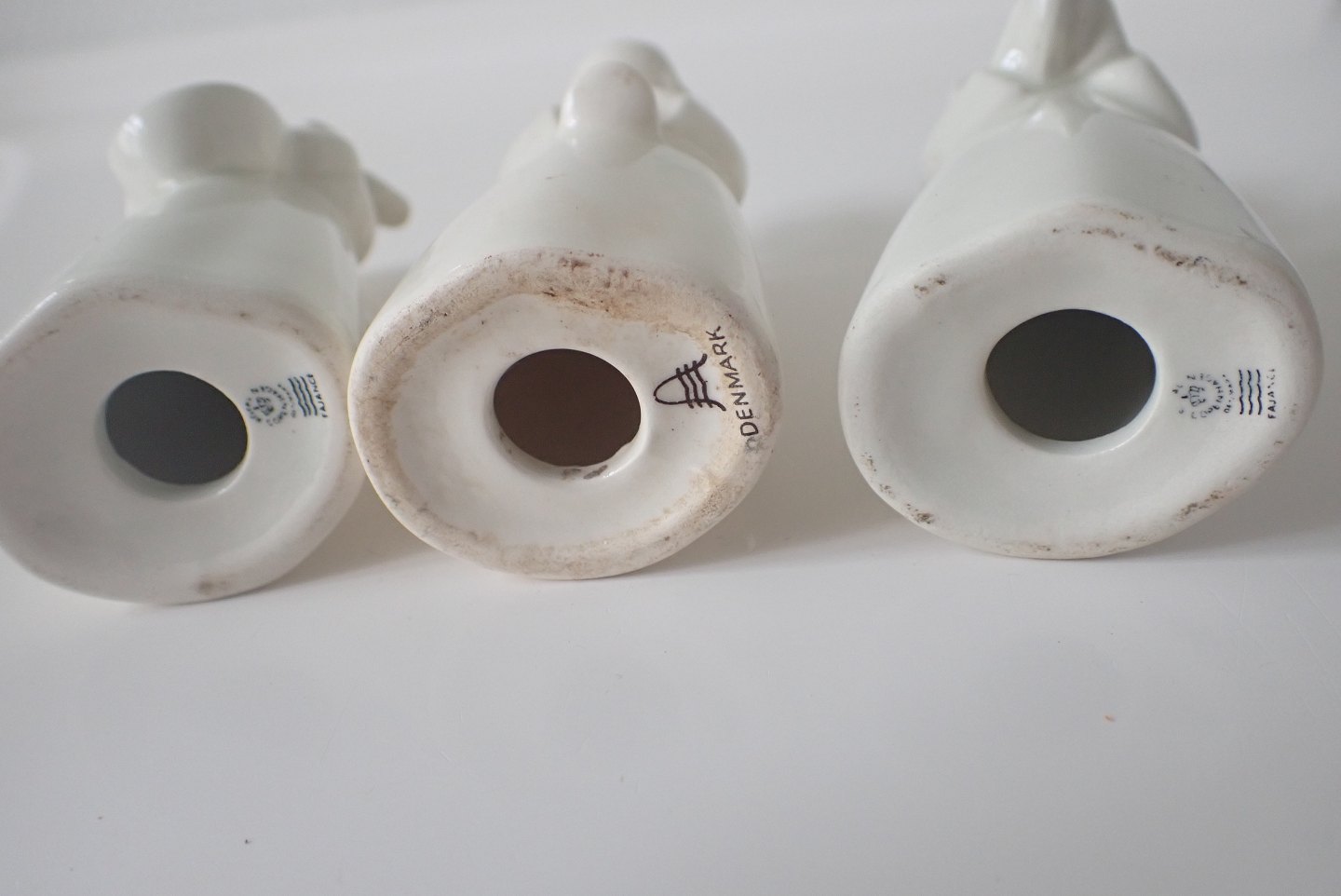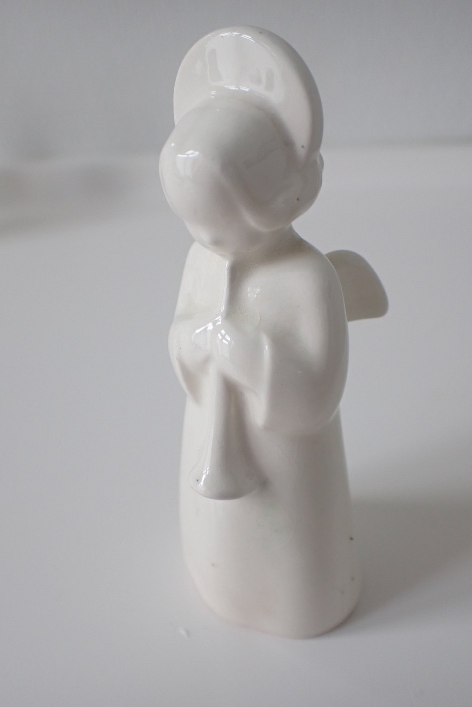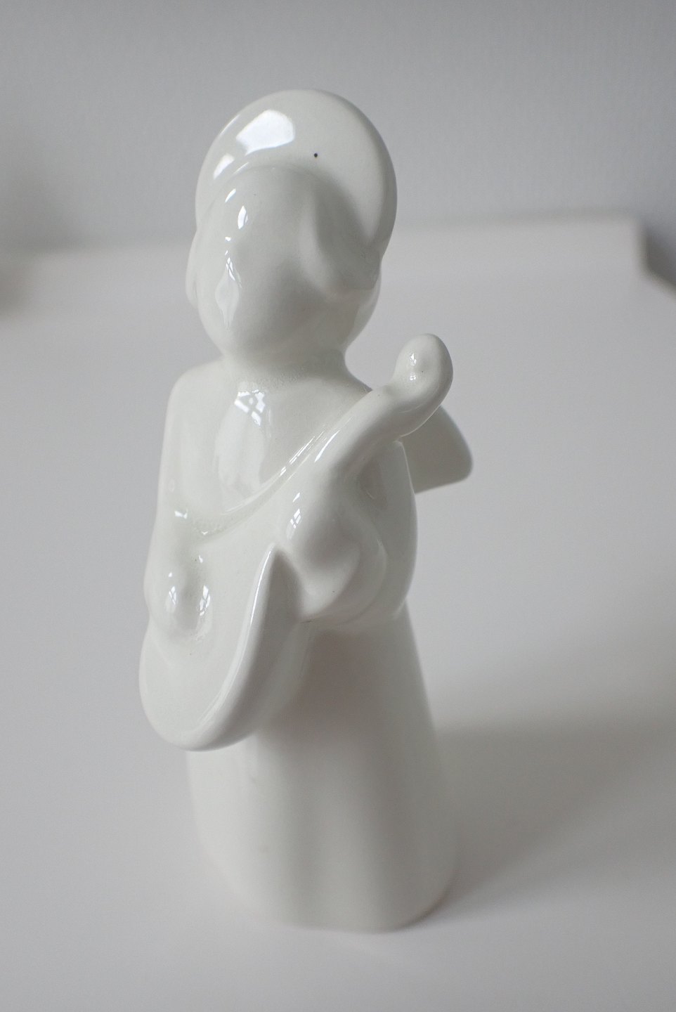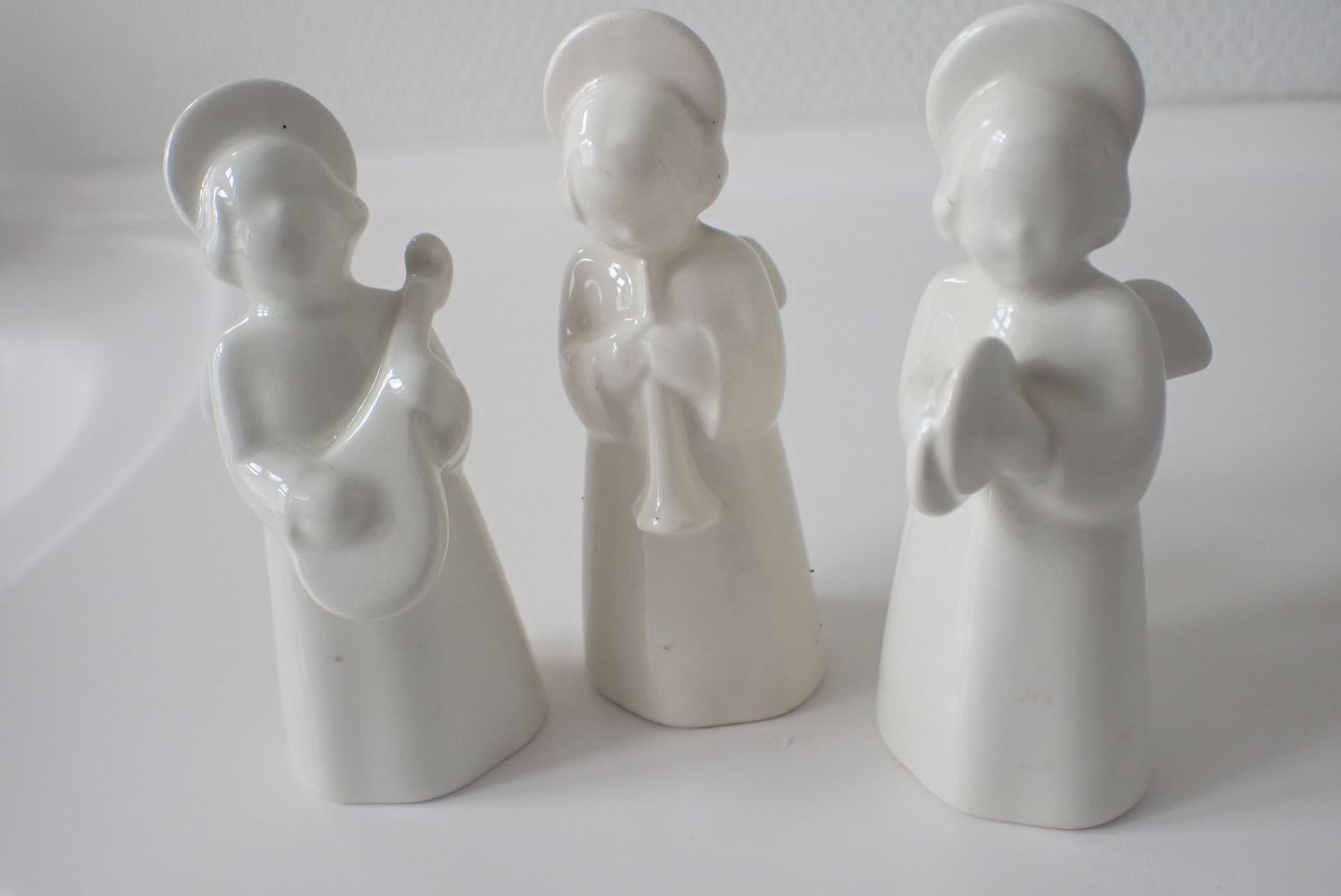 Beskrivelse: 3 musikengle med bækken, fløjte og mandolin i fajance 2 fra Kgl. Porcelæn og 1 fra Aluminia. 1950 -erne. Højde: 9,5 cm. I Fin stand.