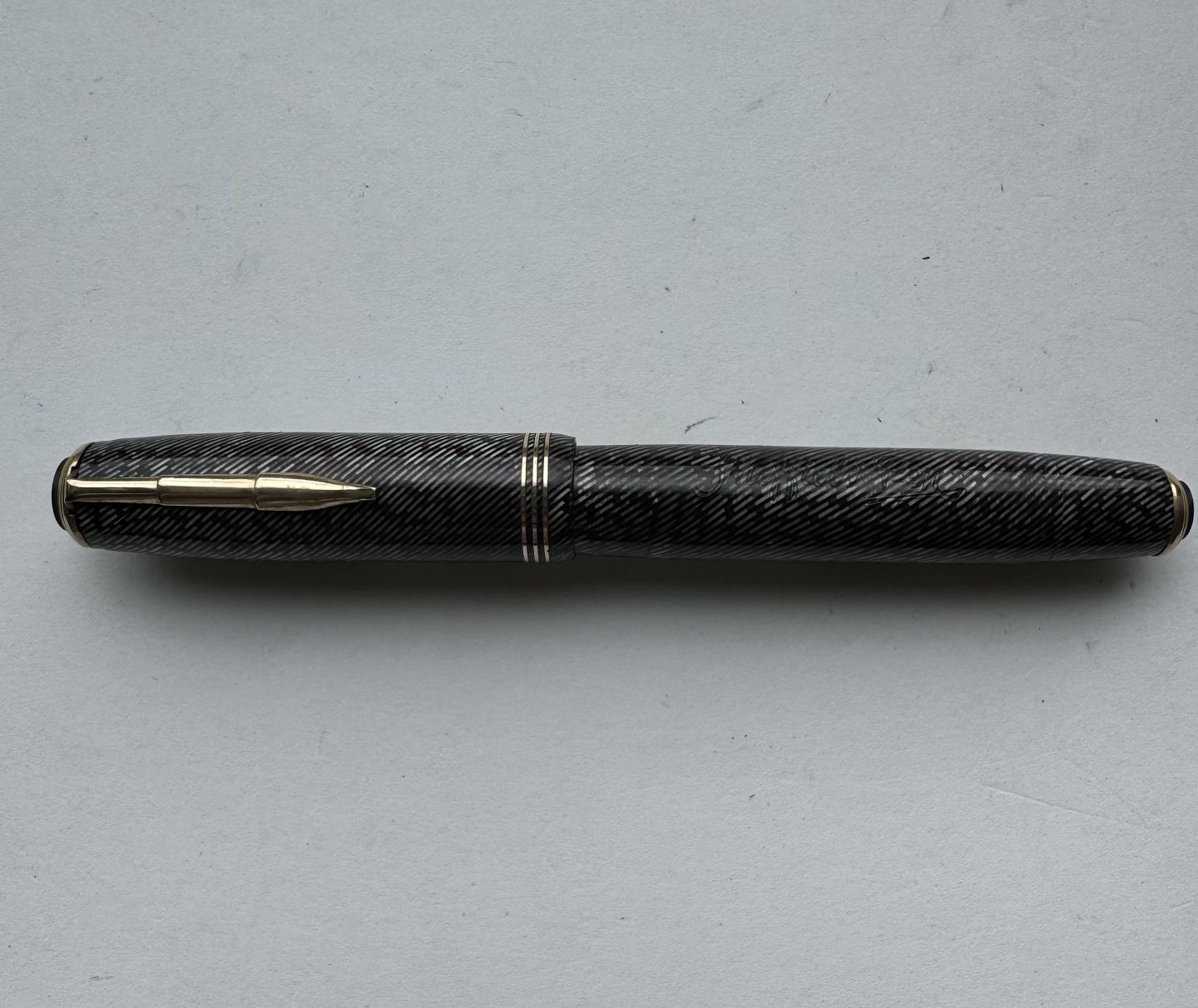 Beskrivelse: Sølv og grøn spiralstribet Sheffield Pen fyldepen fremstillet i 1940’erne. Spidsen er en 14 karat guldstoles fra Oxford. Muligvis et dansk produkt. Har F.eks. Lighed med fyldepenne fremstillet hos Penol. Fremstår i god stand. Fungerer ikke. Der skal indsættes ny gummisæk før end pennen kan optage blæk og skrive igen. Ny gummisæk kan indsættes mod et tillæg på kr. 250,- til fyldepennens pris. Mål: 12,2 cm