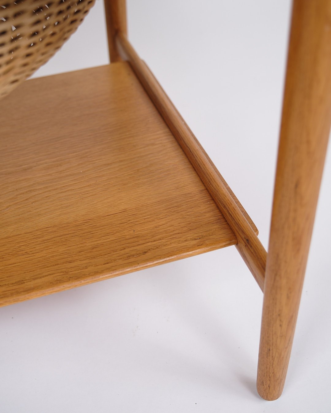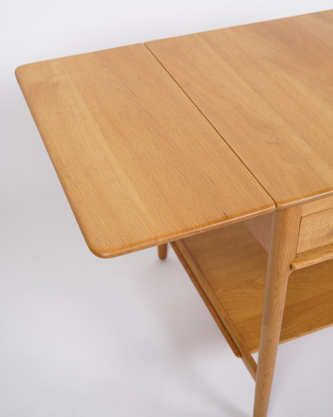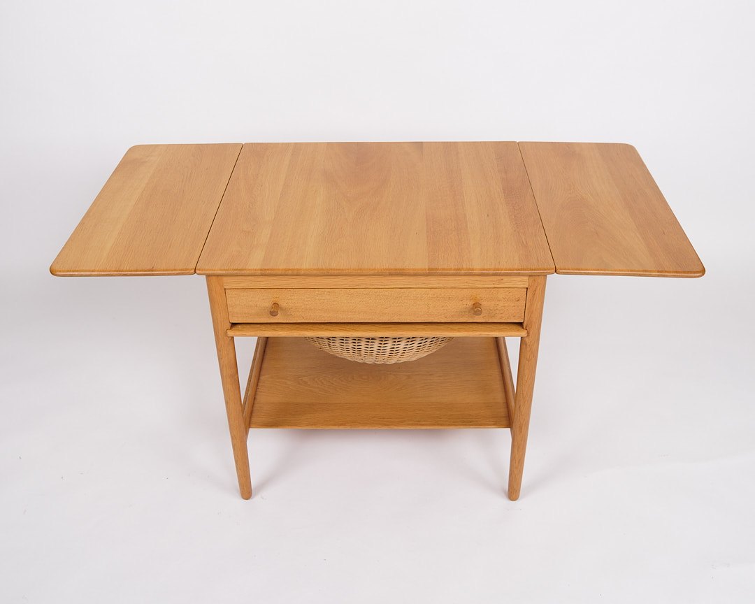 Beskrivelse: Sybord, model AT-33, designet af Hans J. Wegner og produceret af Andreas Tuck i 1950’erne. Bordet er udført i sæbebehandlet egetræ og indrettet med en praktisk hylde. Bordpladen kan udvides fra 64,5 cm til 118,5 cm, hvilket gør det både fleksibelt og funktionelt.