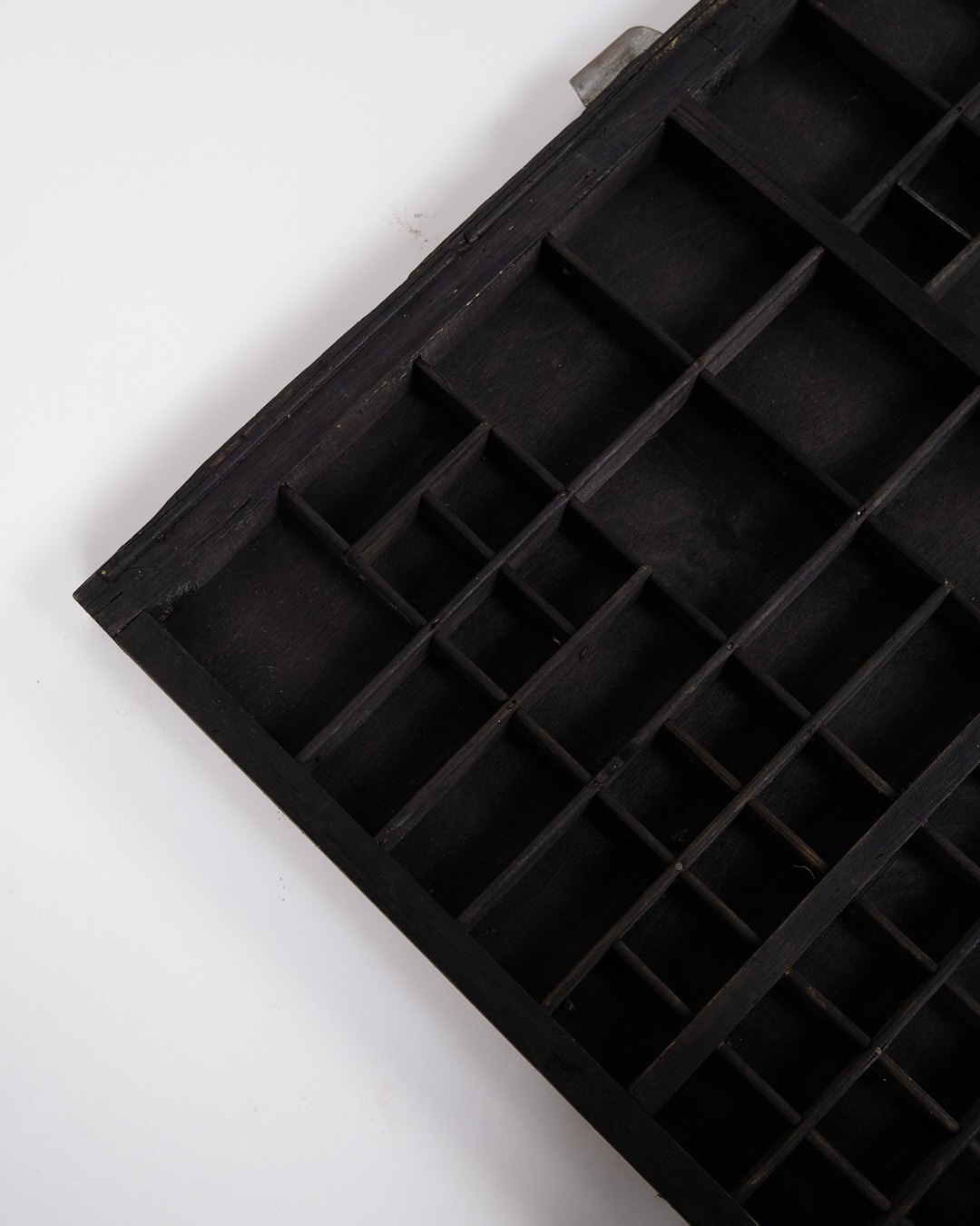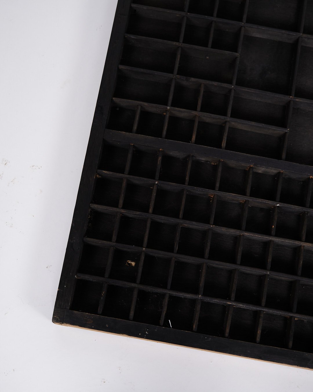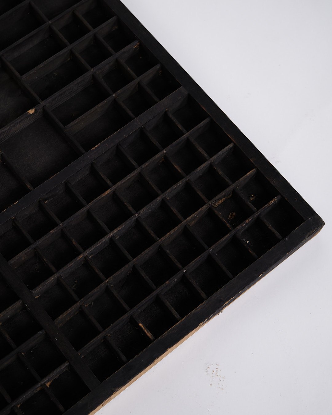 Beskrivelse: Gammel væghængt sættekasse fra 1930’erne. Sort bemalet træ med små rum.