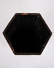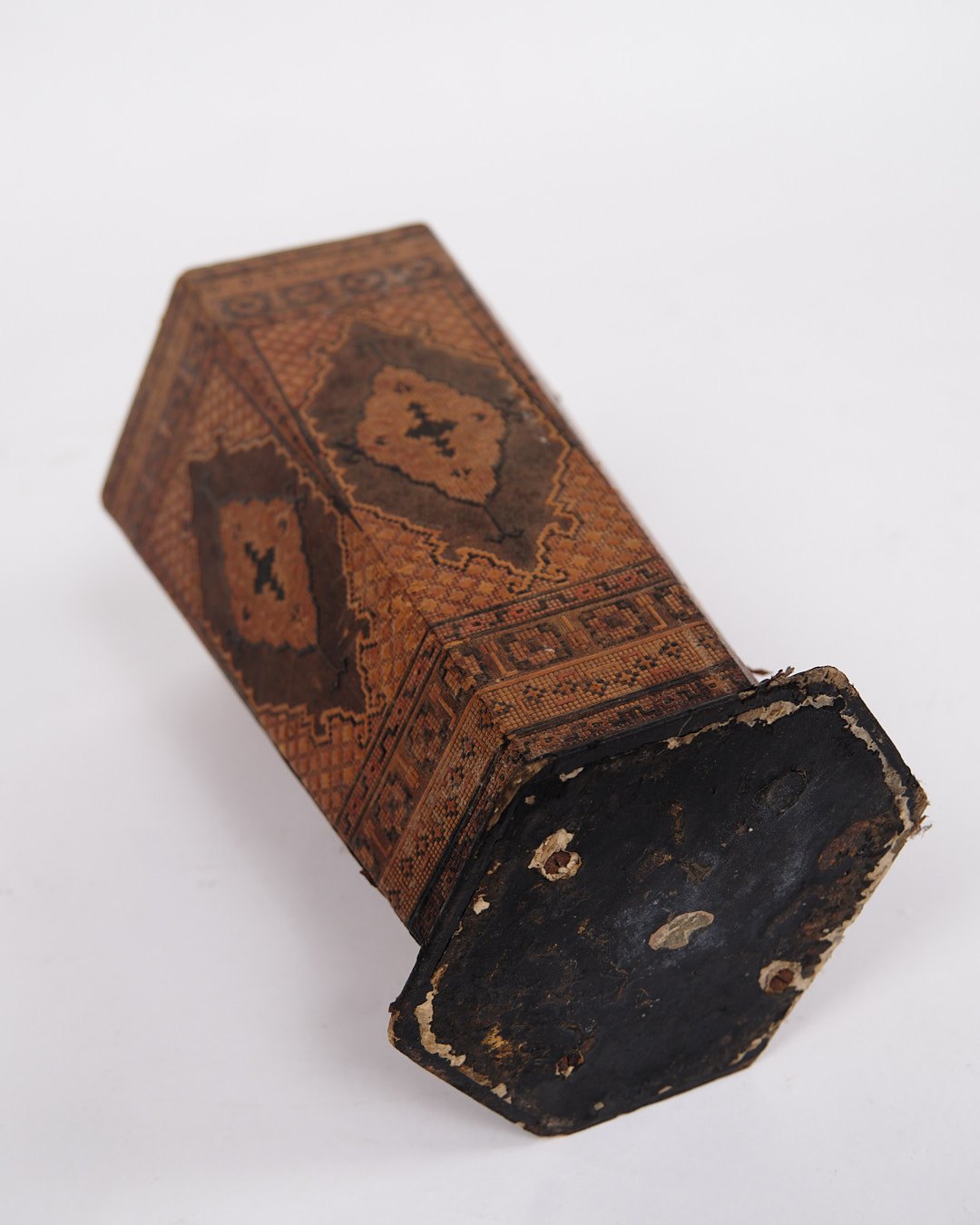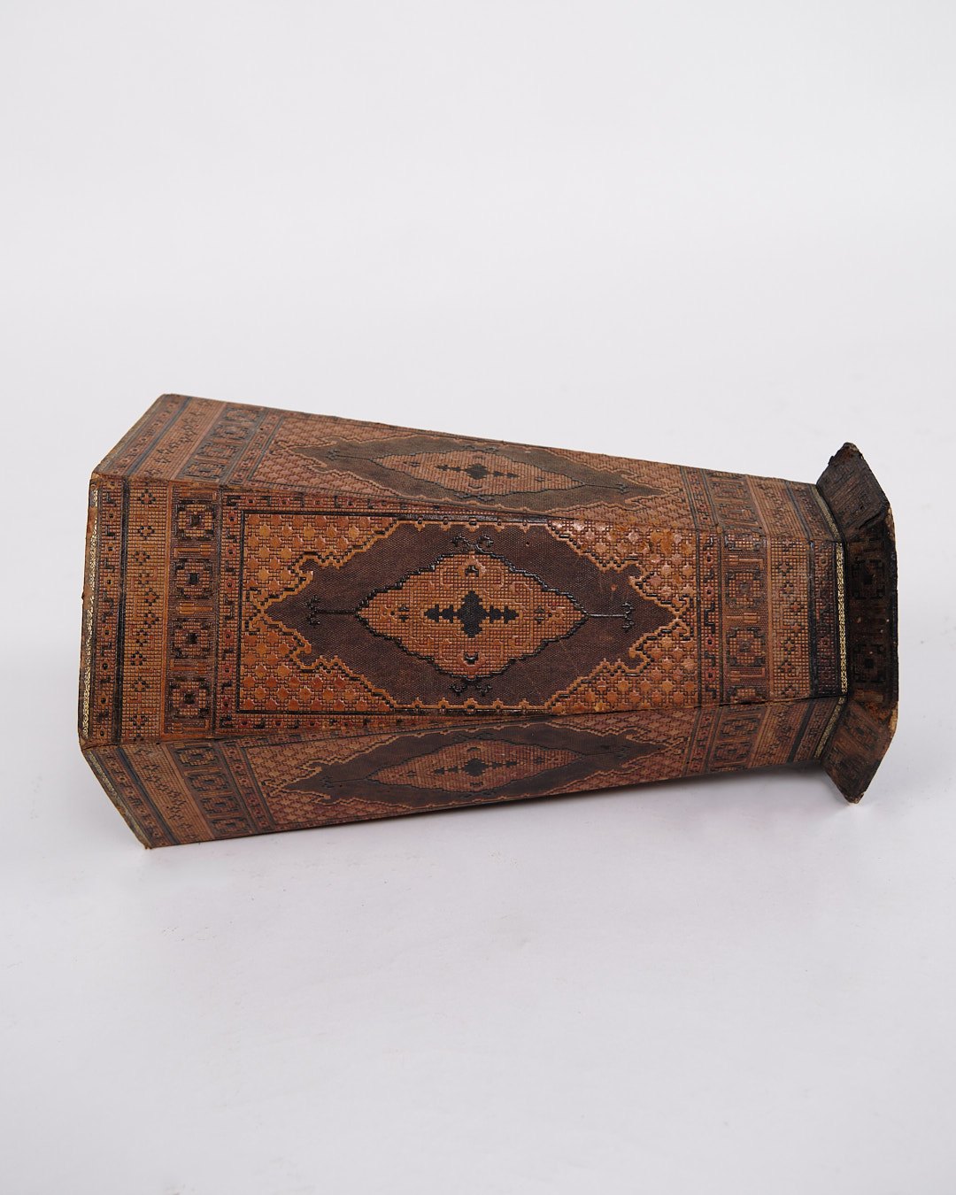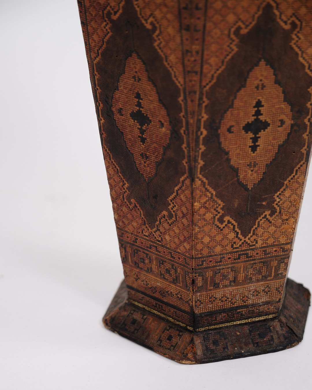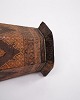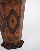 Beskrivelse: Dekorativ vase fra 1900-tallet, udført i mørkt træ med smukt orientalsk inspireret intarsia.