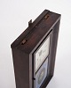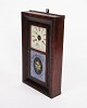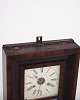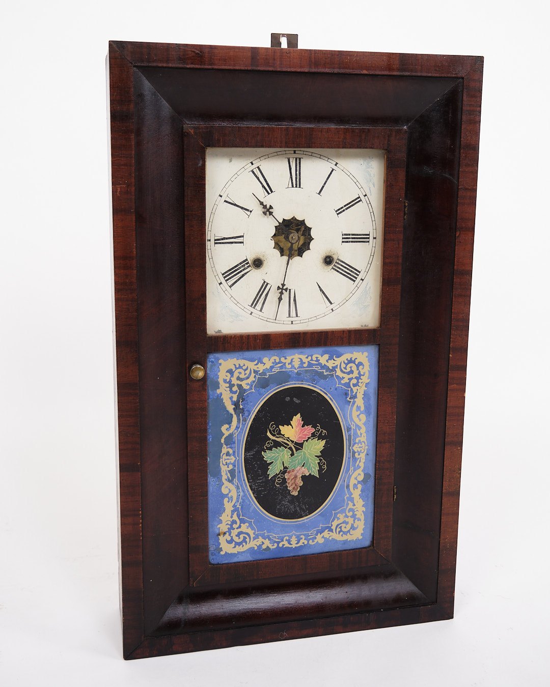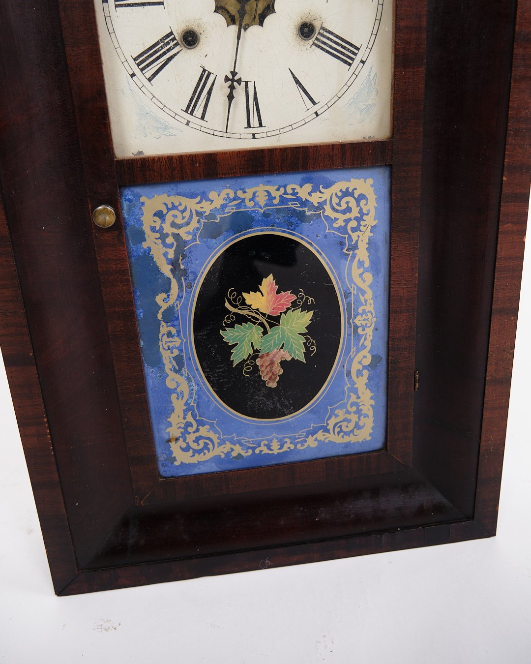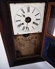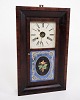 Beskrivelse: Dekorativt amerikanerur fra 1800-tallet, udført i mørkt træ. Uret har en klassisk urskive med romertal og en bemalet glasrude, der giver et charmerende og tidstypisk udtryk.