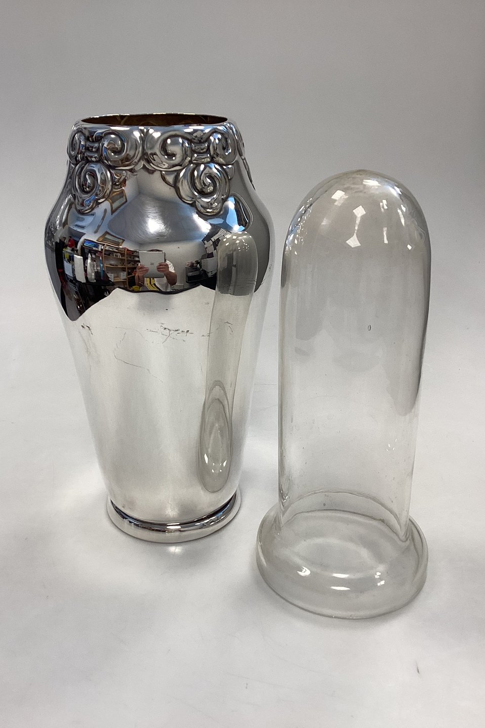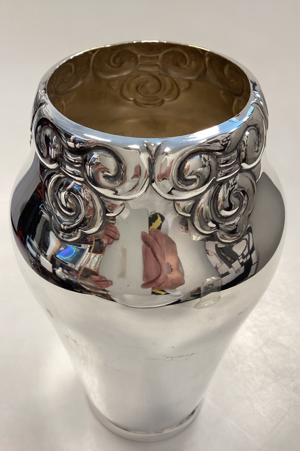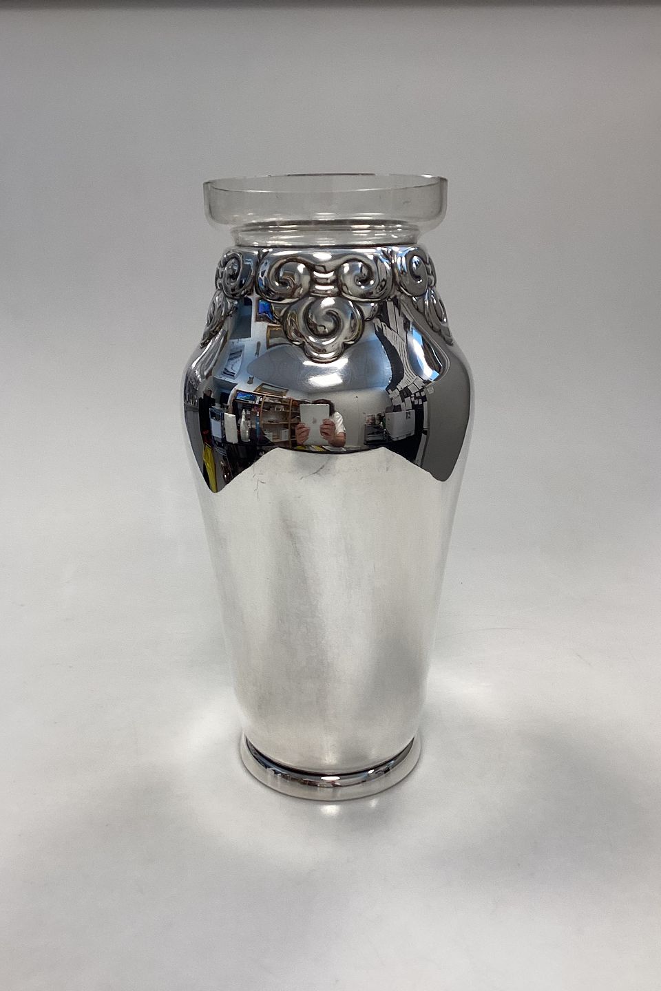 Beskrivelse: Art Nouveau / Deco Sølvplet Vase med glasindsats. Dansk produceret mærket Eneret Astral. Tydelige slidmærker på den ene side, se fotos.