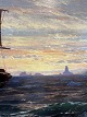 Beskrivelse: I E C Rasmussen parti fra Grønland med skib, isbjerge og solnedgang