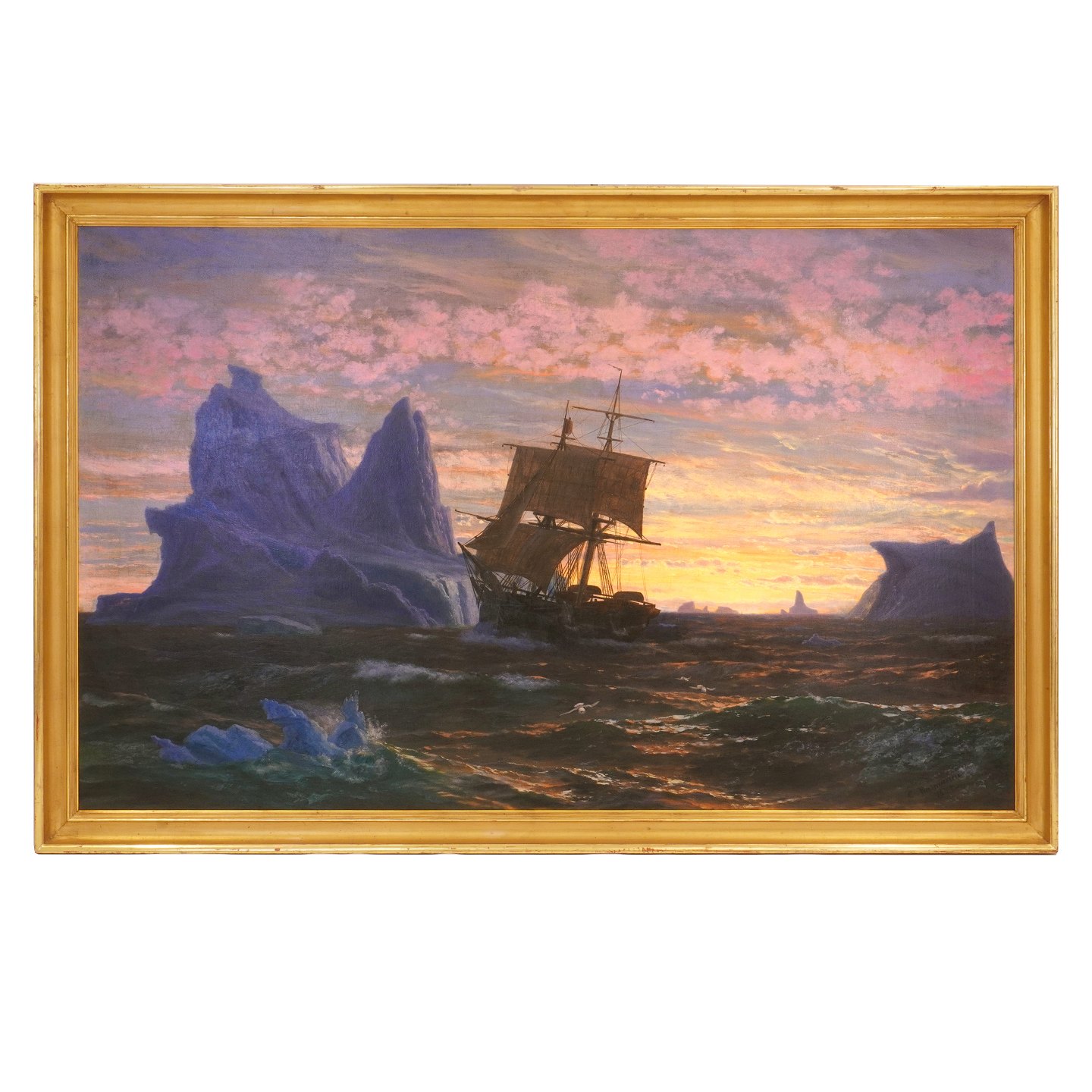 I E C Rasmussen parti fra Grønland med skib, isbjerge og solnedgang. Jens Erik Carl Rasmussen, 1841-93, olie på lærred. Signeret og dateret 1872. Lysmål: 98x156cm. Med ramme: 112x170cm