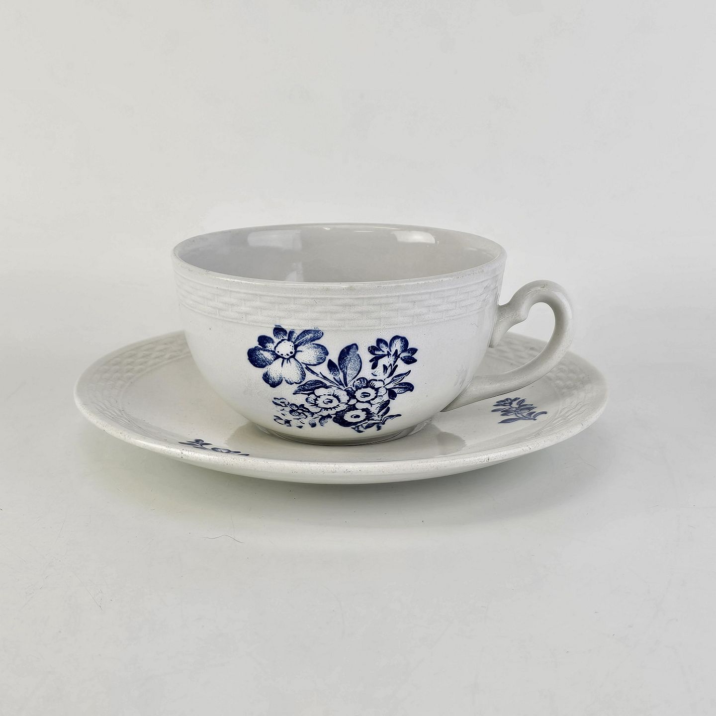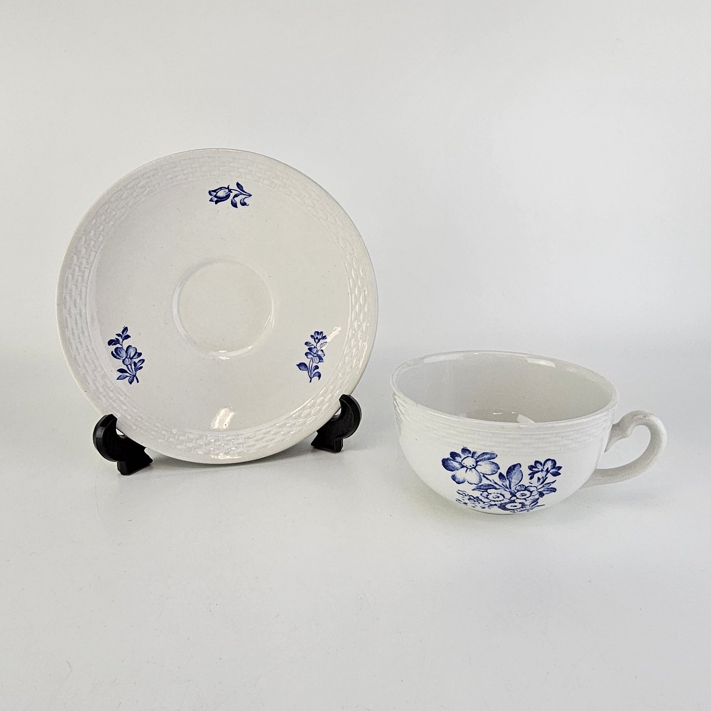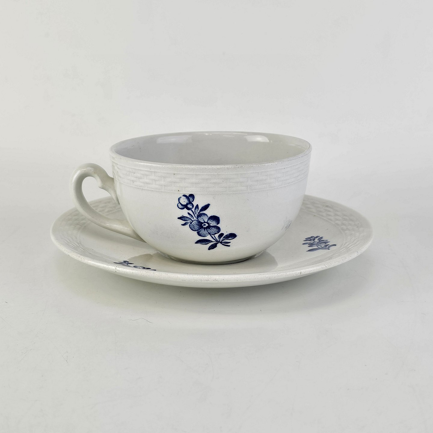 Stel i glat hvid fajance med dekoration af blå blomster og flettet kant