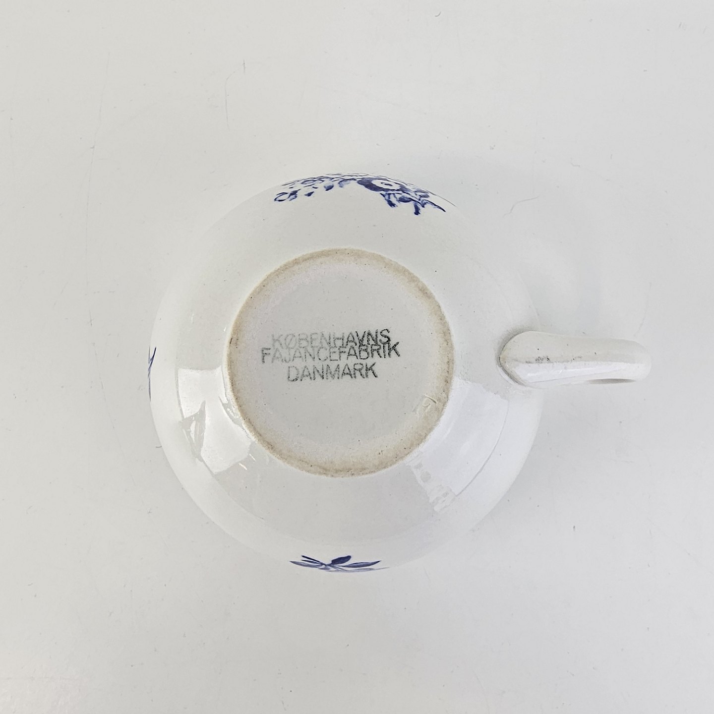Beskrivelse: Kop og underkop i fajance fra stellet Blå blomst
