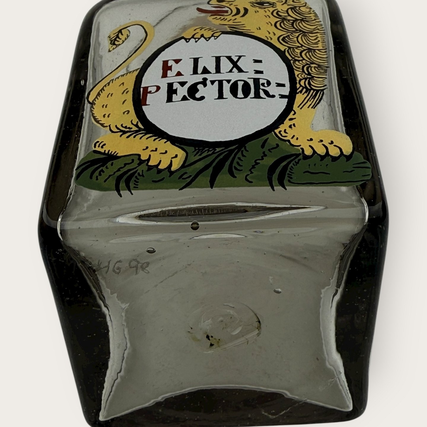 Beskrivelse: Holmegaard apotekerflaske fra 1998, Elixpector, Mål: 10x6x6cm, flaskerne er mundblæste kopier af originale gamle apotekerflasker, Signeret Hg98.