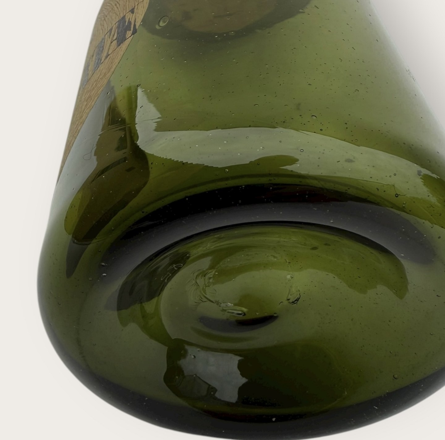 Beskrivelse: Holmegaard apotekerflaske fra 1985, Nuces Moschatæ (Muskatnød), Mål: 18x8cm, flaskerne er mundblæste kopier af originale gamle apotekerflasker, Signeret Hg85.