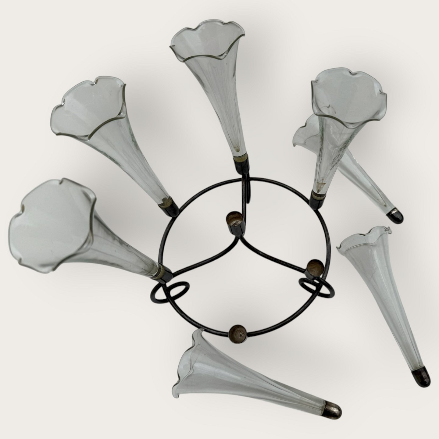 Beskrivelse: Epergne vase, Fint tyndt glas med flæsekant, alle vaser med sølvpletmontering, 7 vaser i art nouveau holder, ca. 19cm høj og 24cm i diameter, hver glasvase 13x5cm *Fin stand*