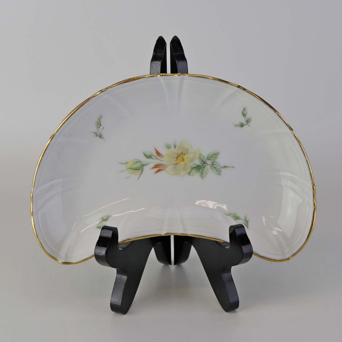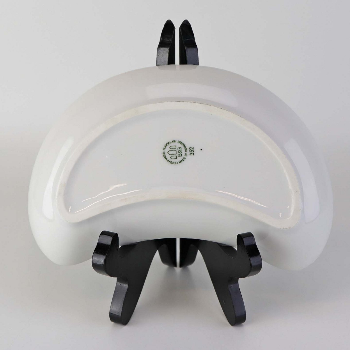 Beskrivelse: Halvmåneformet fad i porcelæn fra stellet Klitrose. Nr. 352