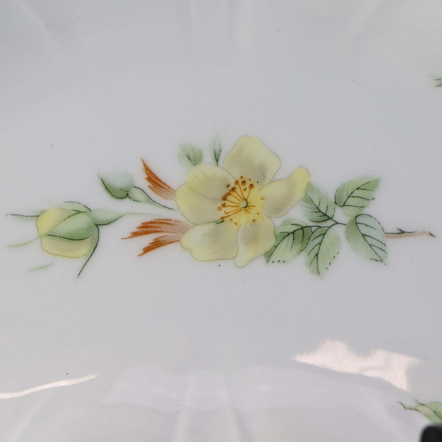 Service i glat hvidt porcelæn med lige knækkede kanter dekoreret med gule blomster og gylden kant
