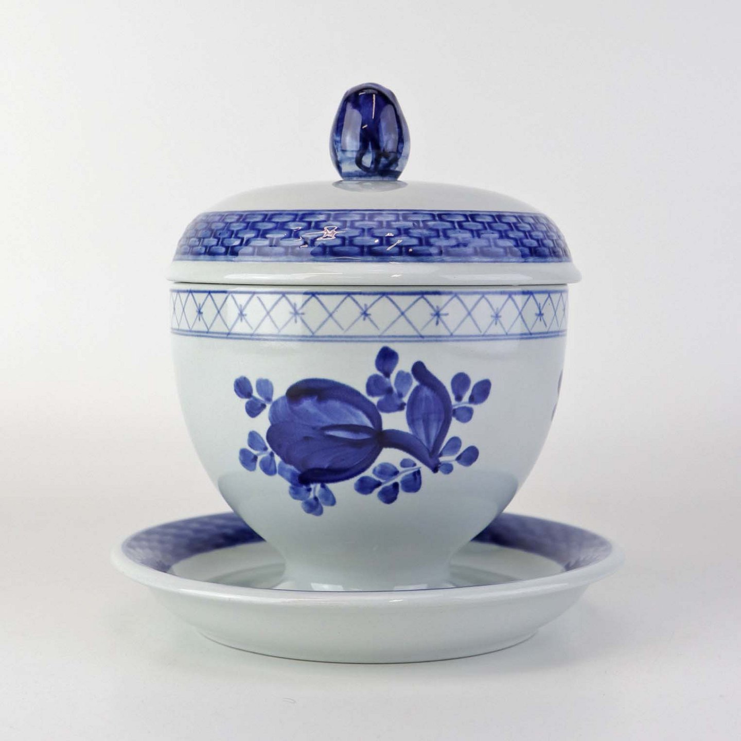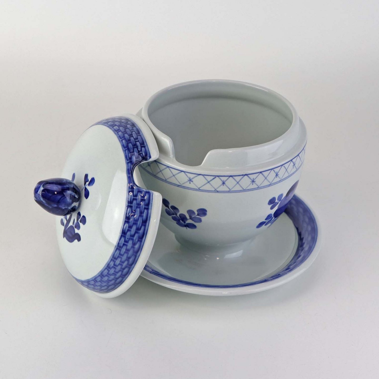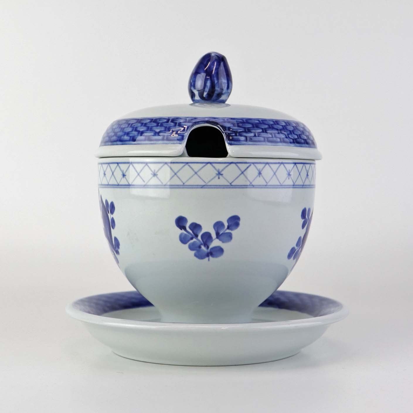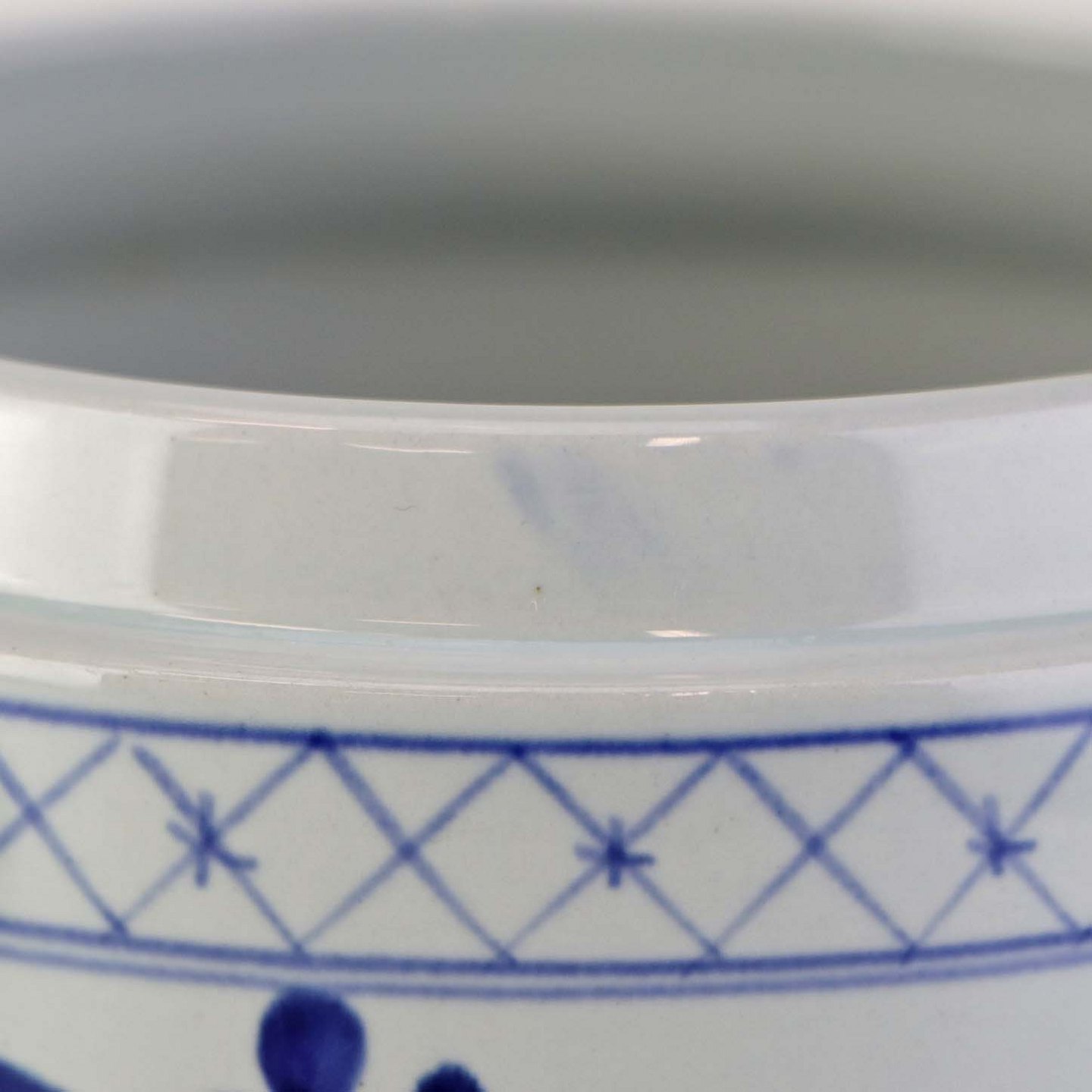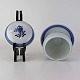 Beskrivelse: Marmeladekrukke med låg og fast bund i fajance fra stellet Blå Tranquebar. Nr. 11/1171