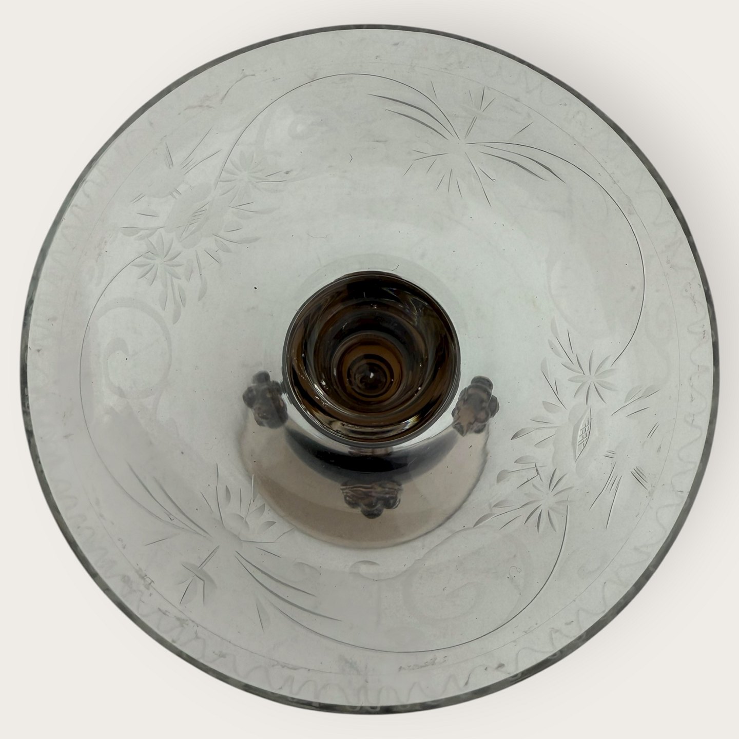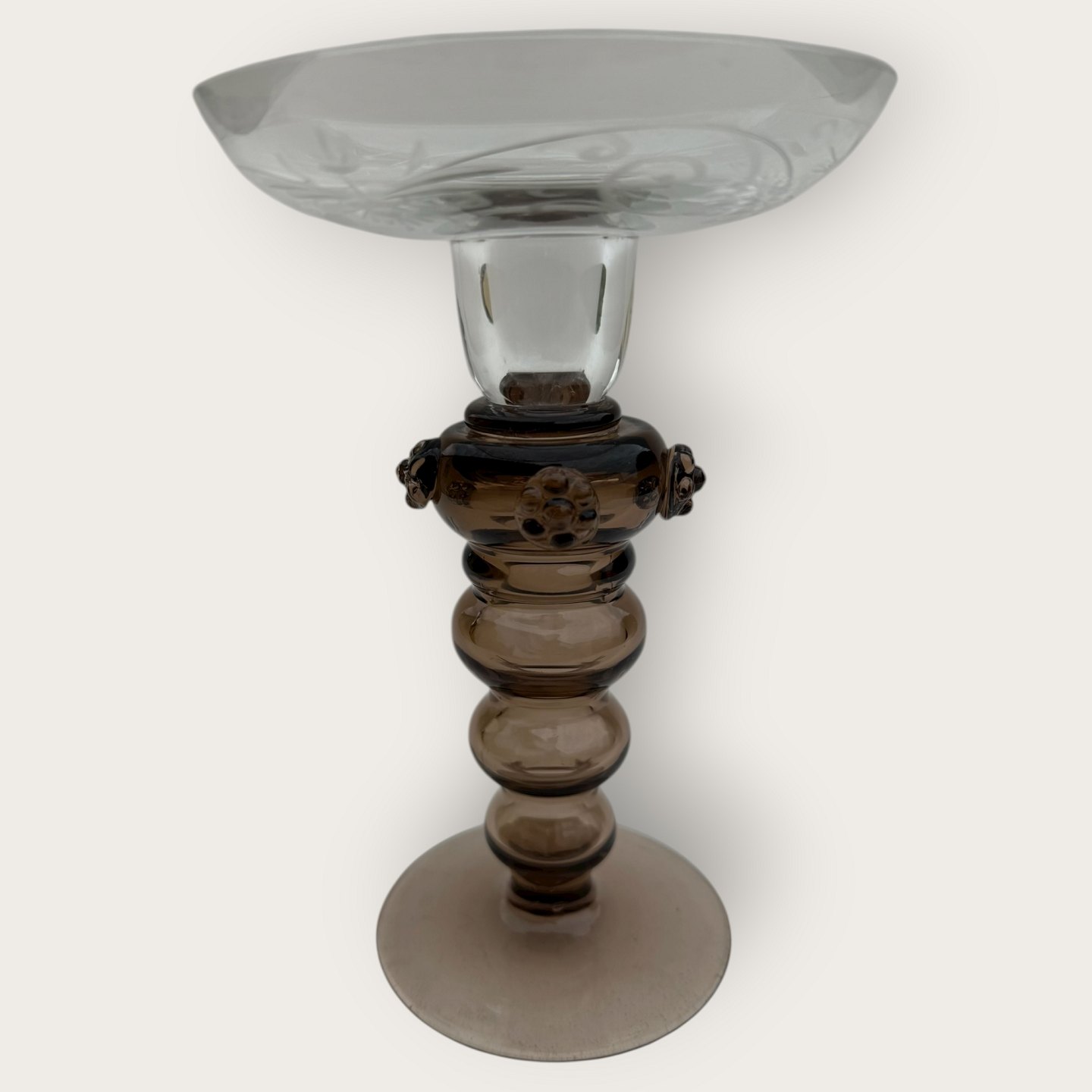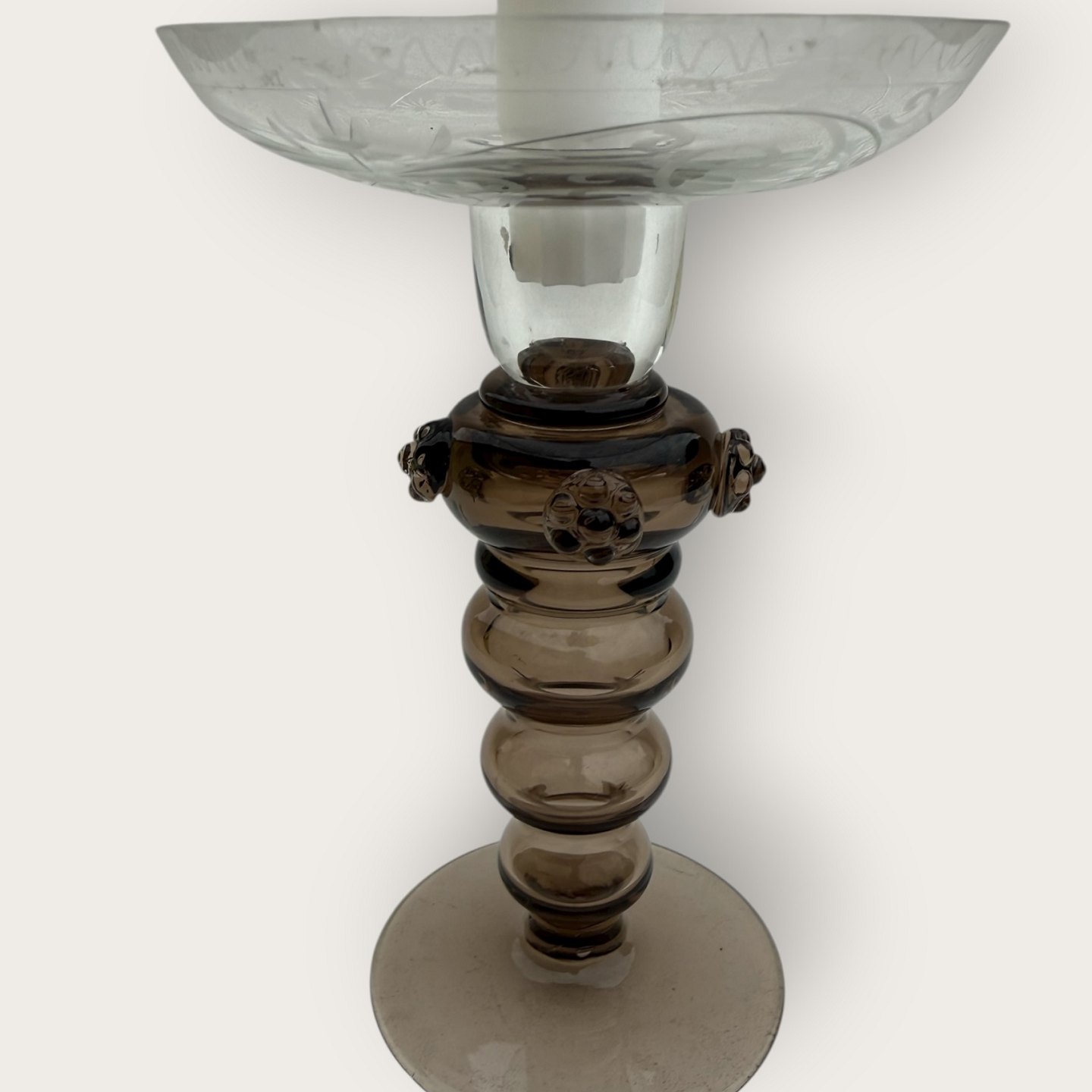Beskrivelse: Gammel glaslysestage, hul brun stamme med rosetter, Skål med slibninger affugle, mønster og blomster, flot stand, højde 16,5cm, diameter 11cm