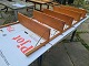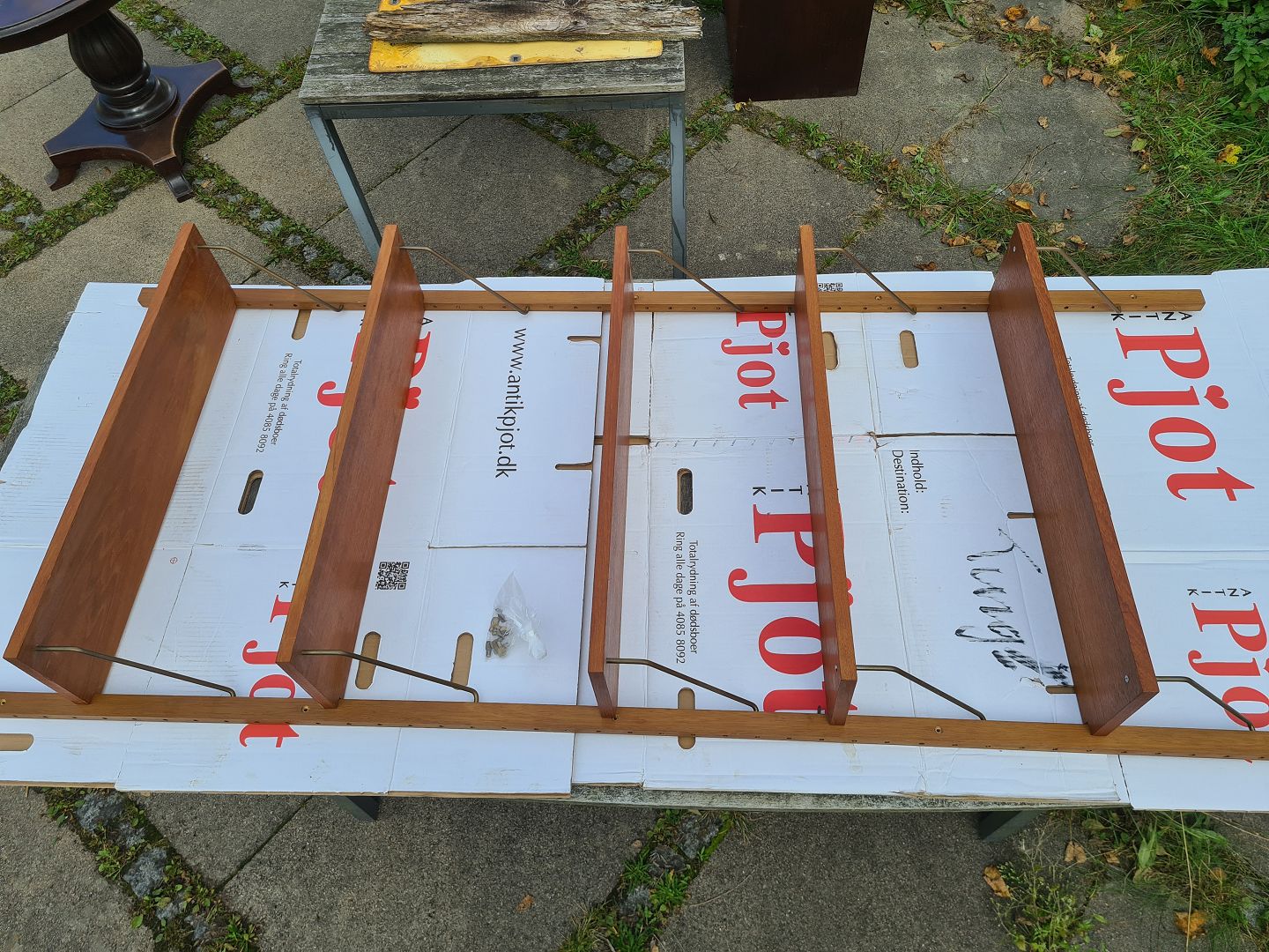 Beskrivelse: Reol til ophængning på væggen fra 1960'erne i finéret teak. Består 5 hylder á 80 x 20 cm. og 2 vanger á 198 cm. Pænt og ok velholdt dog med lidt brugsspor i form af overflade skrammer og uoriginale skruer. (Billede)