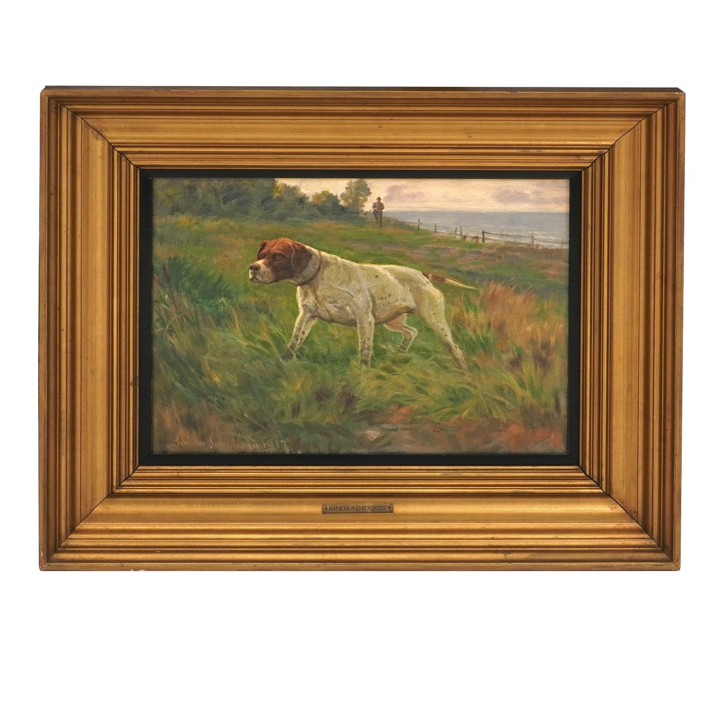 Simon Simonsen maleri. Simon Simonsen, 1841-1928, olie på lærred. Motiv i form af pointer med jæger. Signeret Simon Simonsen og dateret 1917. Lysmål: 23x32cm. Med ramme: 39x48cm