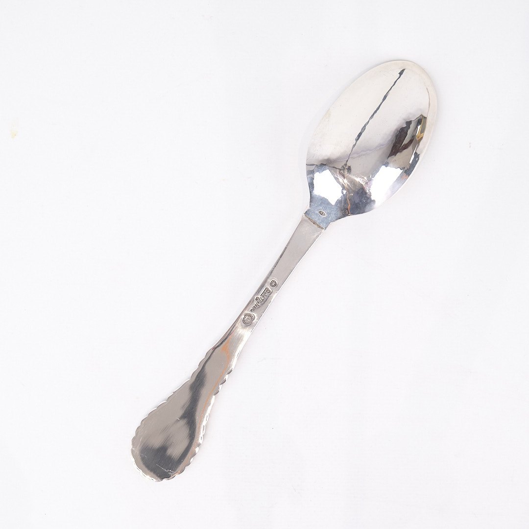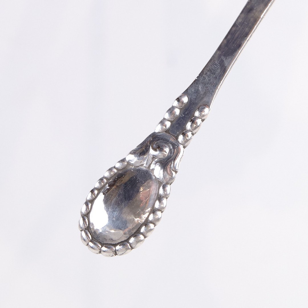 Beskrivelse: Middagsske i mønster nr. 13 af Evald Nielsen. Tretårnet sølv, stemplet. Elegant dansk sølvarbejde.