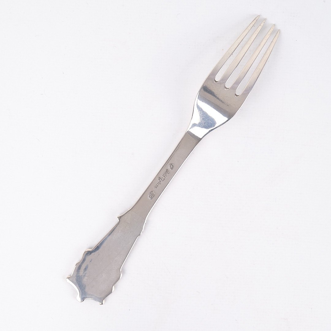 Beskrivelse: Gaffel med Konge-mønster af Evald Nielsen. Sølv 830s, stemplet.
