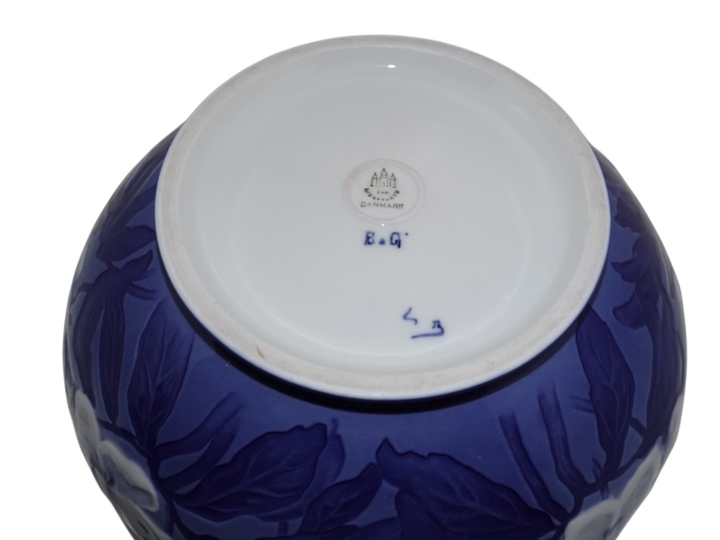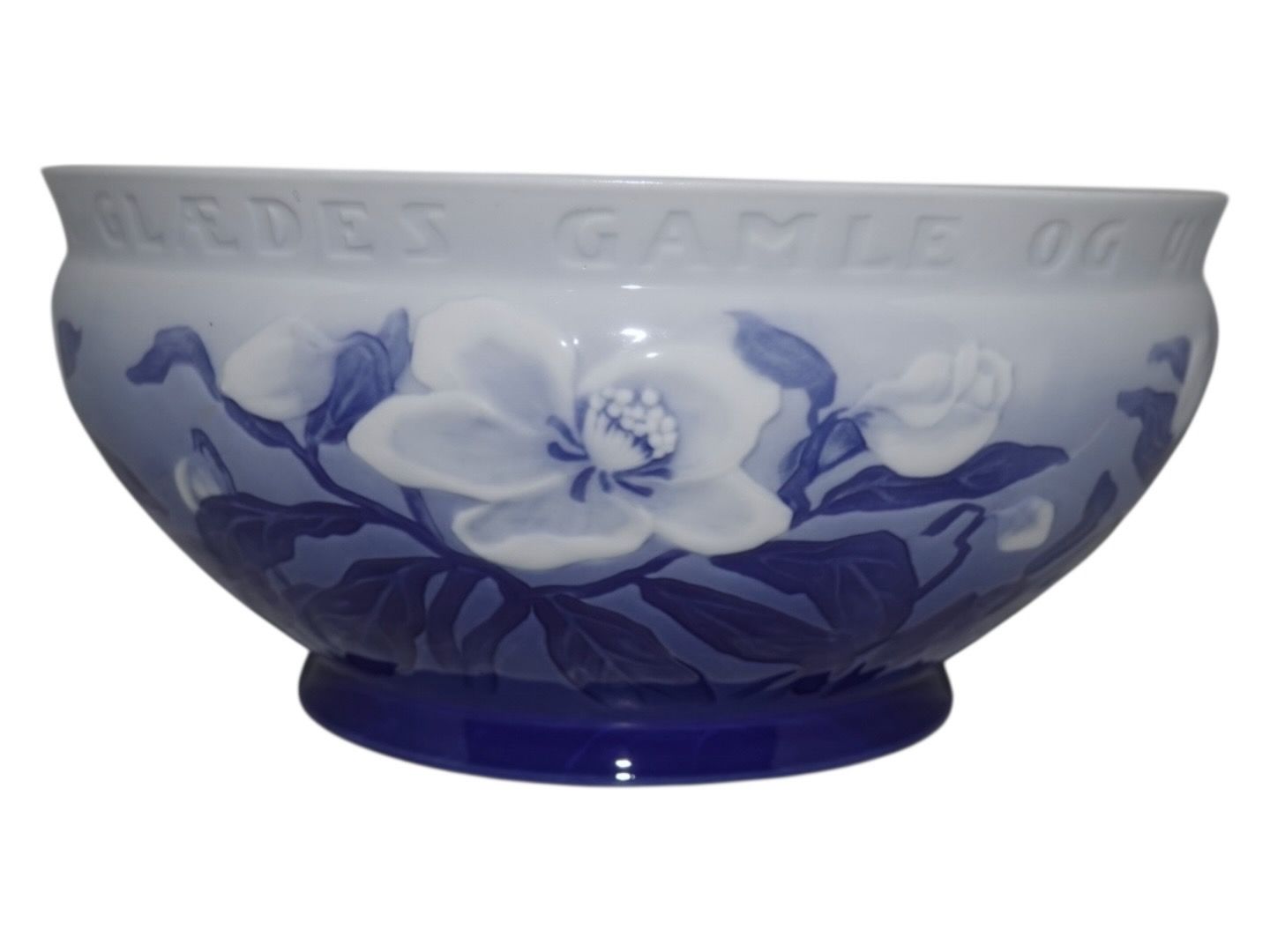 Beskrivelse: Bing & Grøndahl Julerose, sjælden stor bowle/skål med juletekst på siden: "JULEN HAR BRAGT VELSIGNET BUD - NU GLÆDES GAMLE OG UNGE".