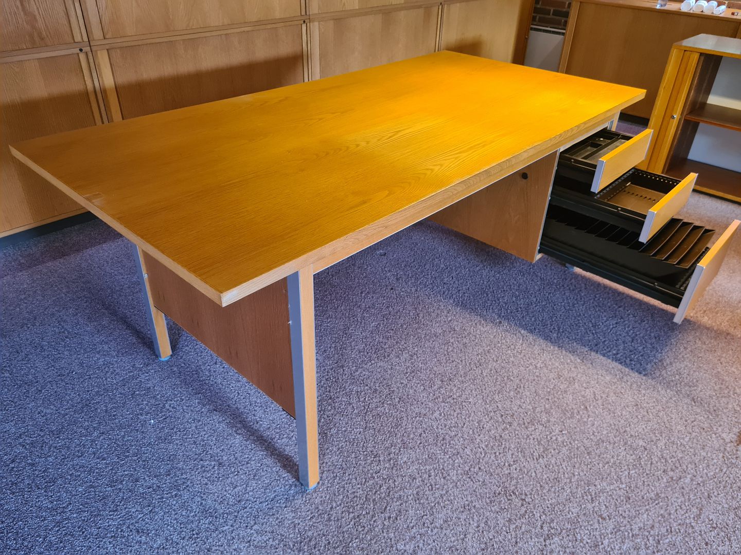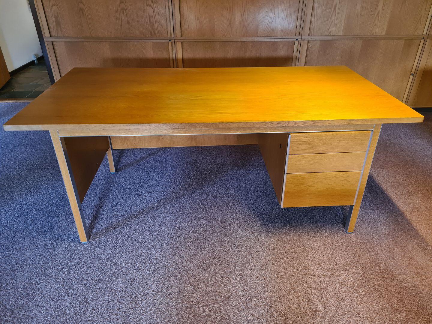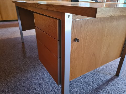 Beskrivelse: Stort Skrivebord fra 1980'erne i eg og aluminium. Fremstår pænt, velholdt og udmærket funktionsdygtigt. Dog med meget let afblegning på bordpladen efter en skrivemåtte. (Ses på billede)