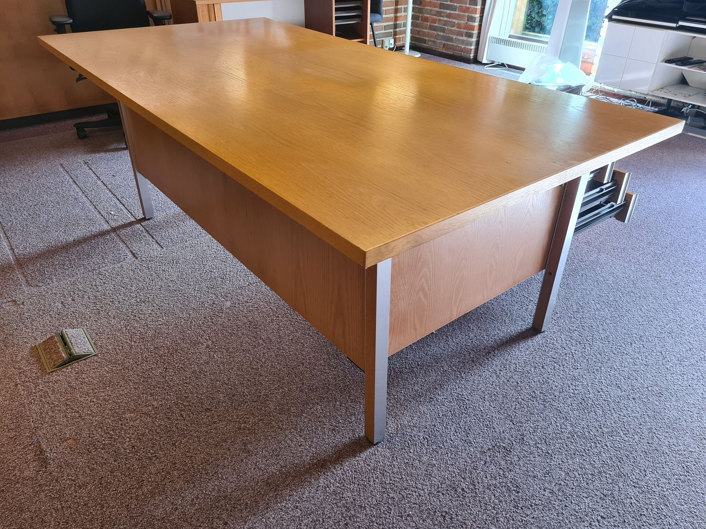 Beskrivelse: Stort Skrivebord fra 1980'erne i eg og aluminium. Fremstår pænt, velholdt og udmærket funktionsdygtigt. Dog med meget let afblegning på bordpladen efter en skrivemåtte. (Ses på billede)