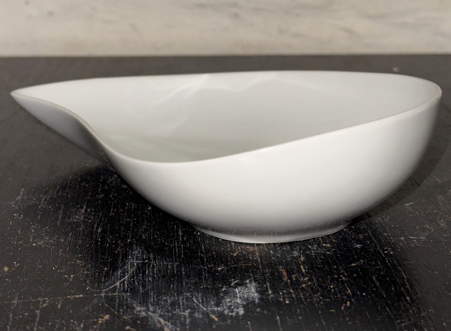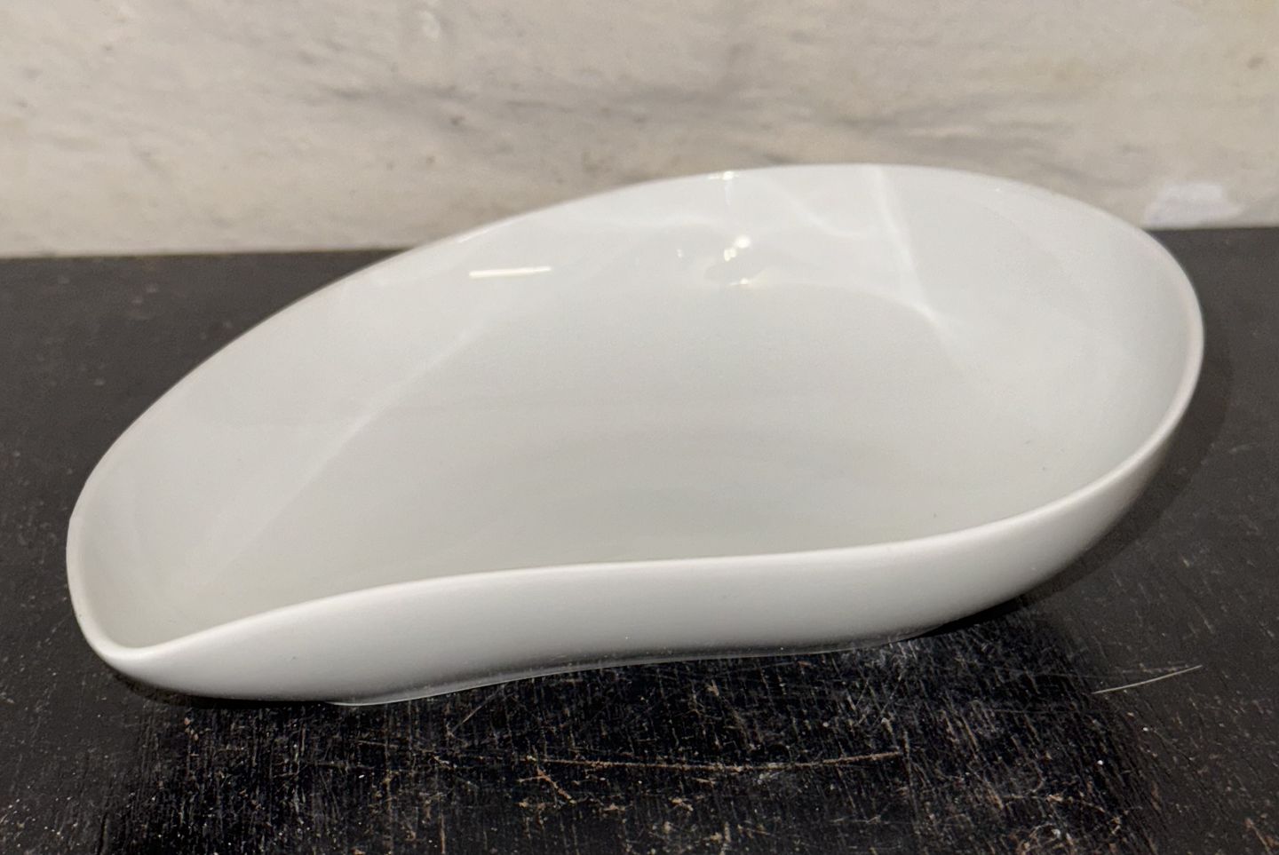 Description: HENNING KOPPEL: Kidney-shaped bowl in white porcelain from Bing and Grondahl. Made at the B&G factory. In good condition. No damage or repairs. Factory first Production. Factory mark on the bottom along with model number 38. Dimensions: H. 4.2 cm L. 16.4’cm W. 12 cm