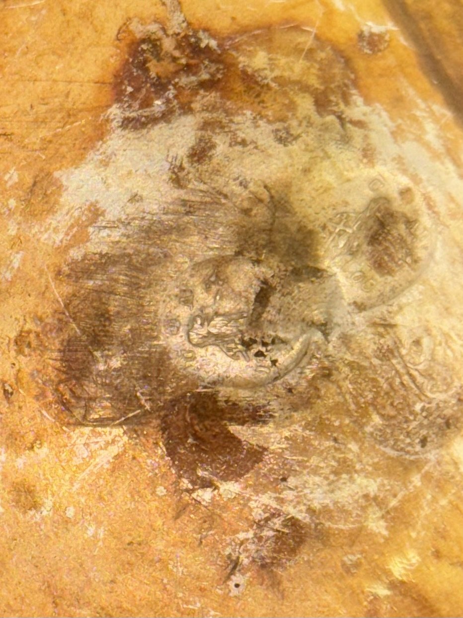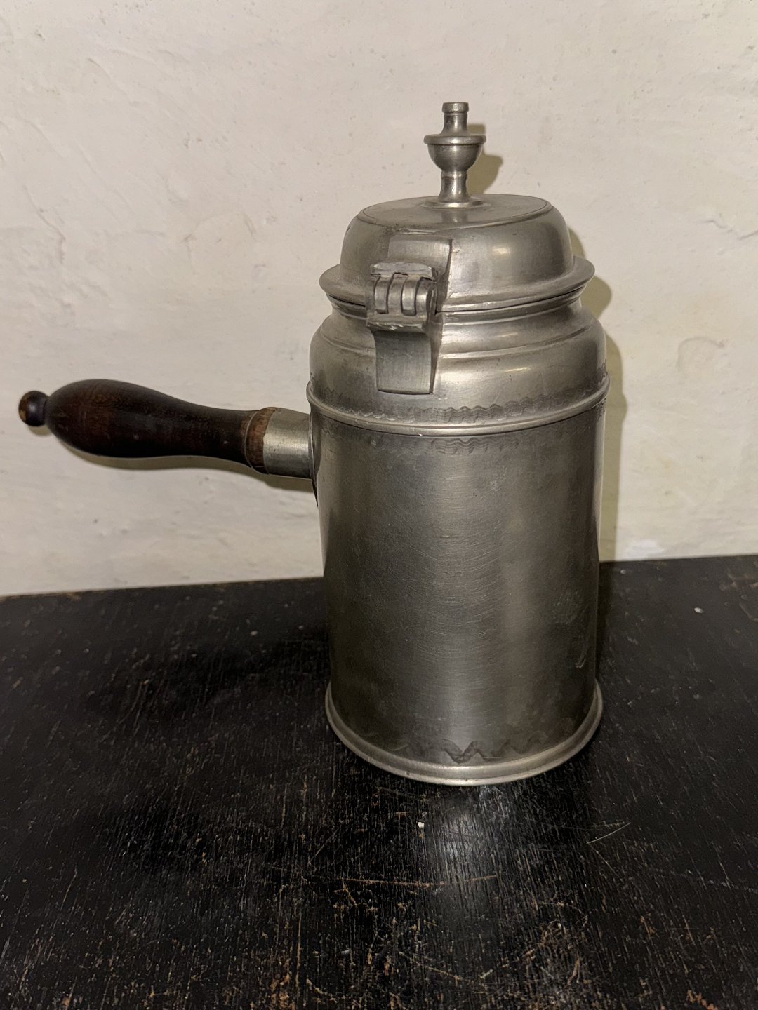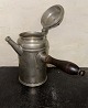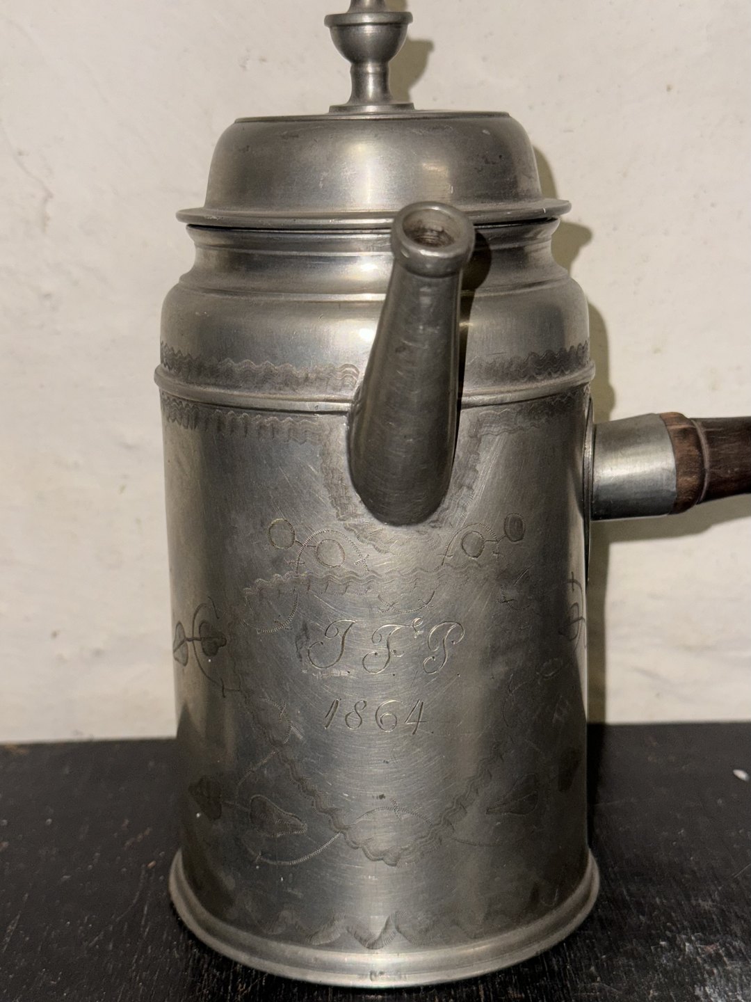 Beskrivelse: Kaffekande med låg i tin med stjerthåndtag i træ. Indgraveret dekoration på forsiden hvori der ses ejerinitialer samt året 1864. Fremstår i god stand. Stemplet indvendigt på bunden (utydeligt). H. 21,5 cm