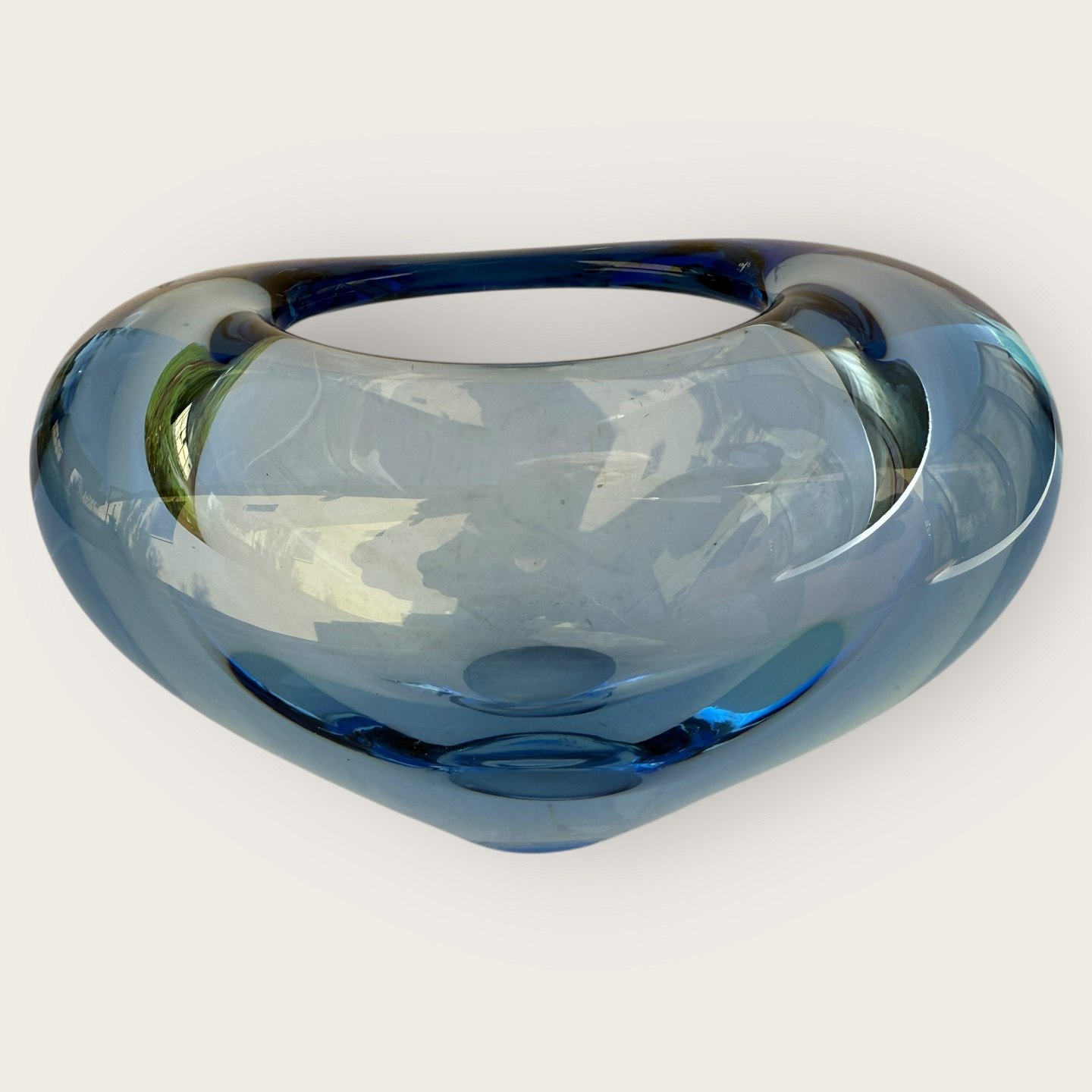 Beskrivelse: Holmegaard, menuet, Hjertevase, Lys blå, # 220737, 15cm bred, 10cm høj, Design Per Lütken *Pæn stand med små brugsspor*