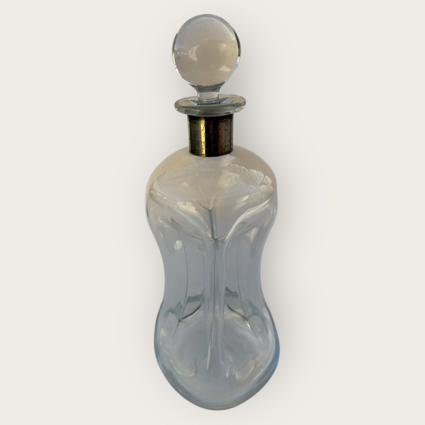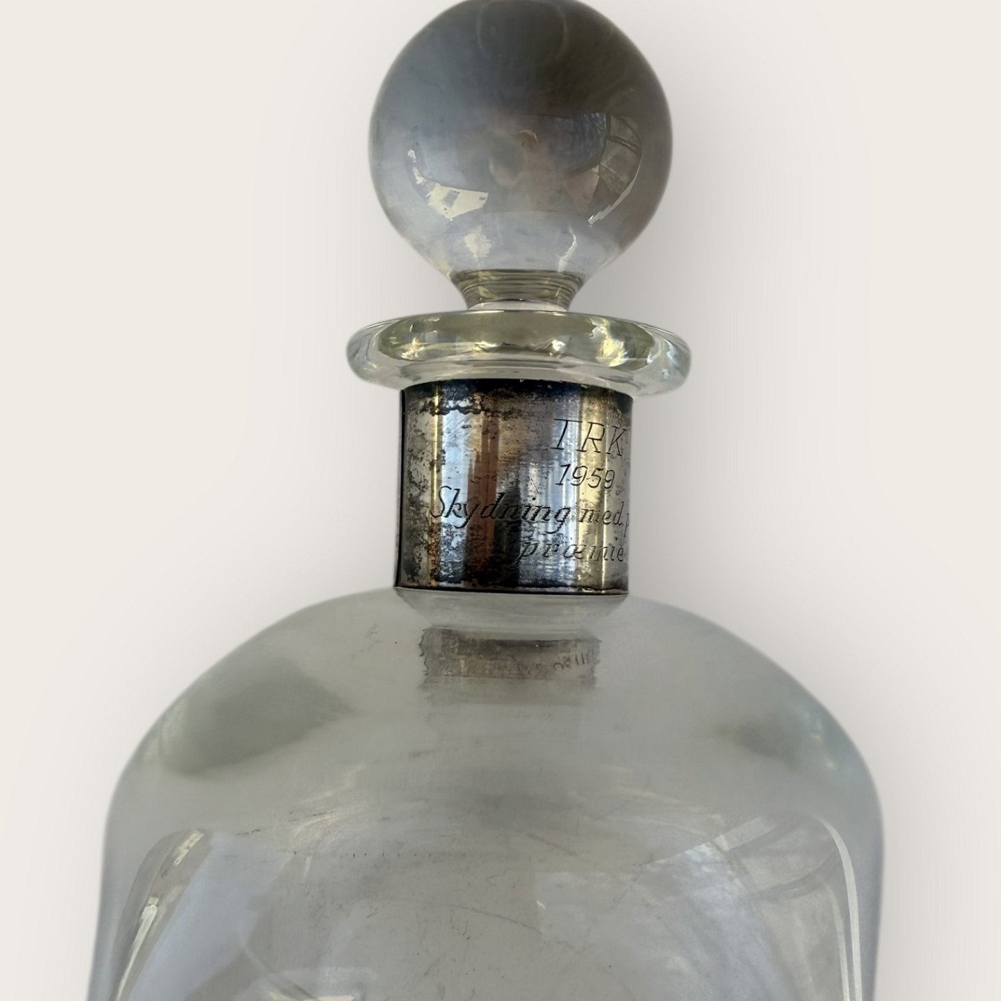 Beskrivelse: Stor klukflaske med sterling sølvmontering fra E. Dragsted, indgraveret: Præmie skydning med Pistol 1959, Højde 32cm *fin stand*