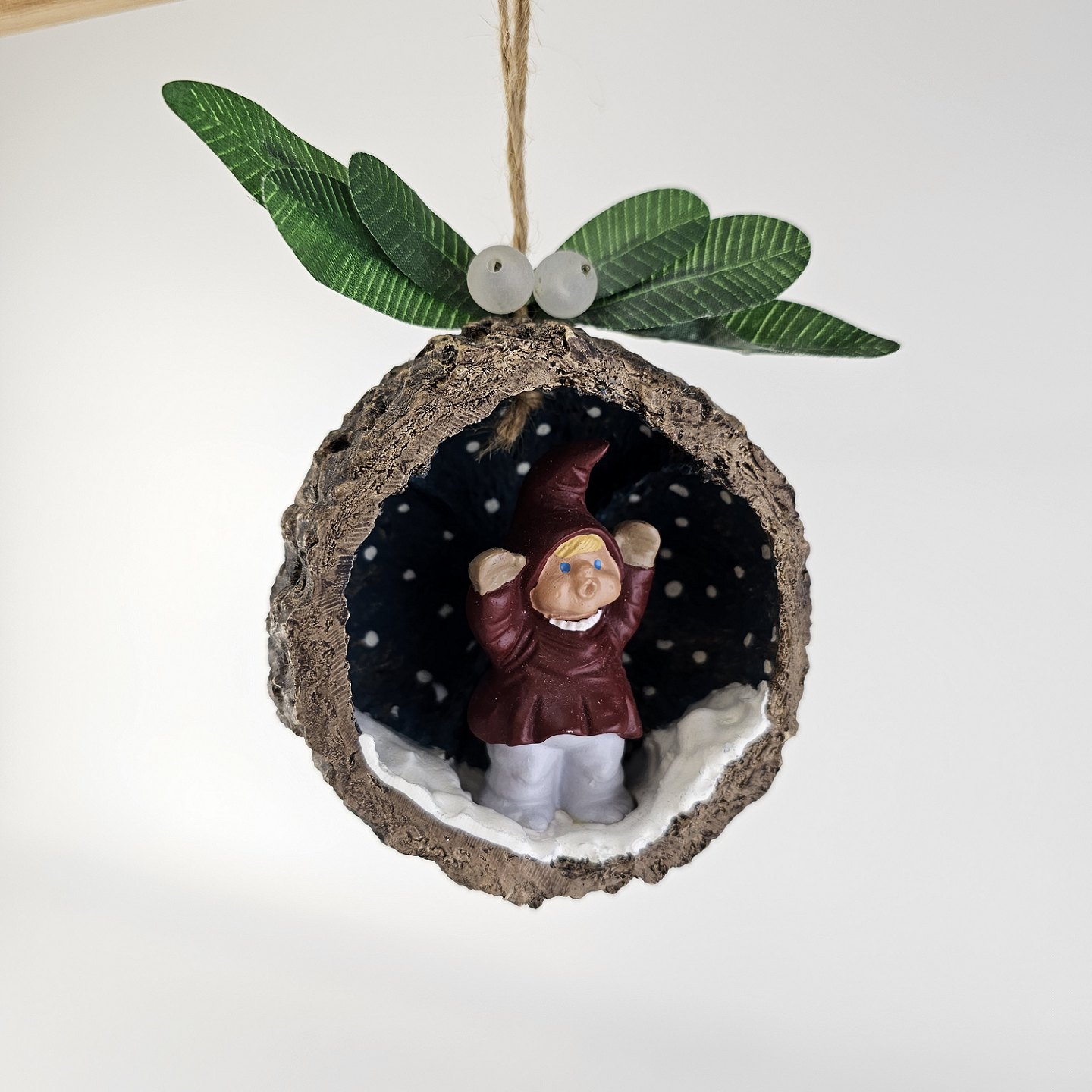 Beskrivelse: Figursæt til ophæng med motiv af nisserne Mai og Max i kokosnødder