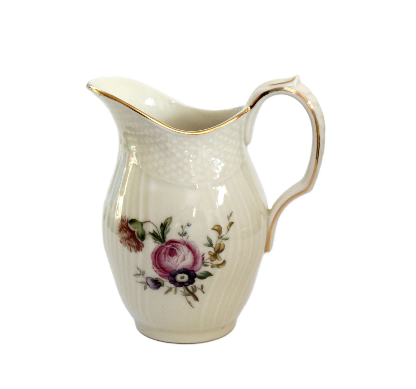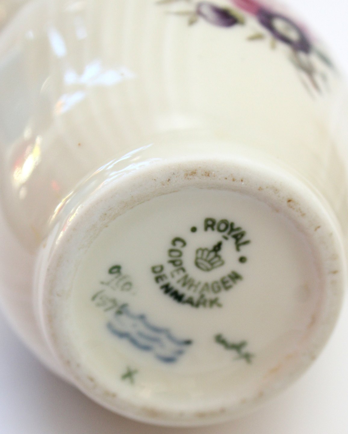 Beskrivelse: Royal Copenhagen, Frisenborg svejfet stel creme med forskellige blomstermotiver og guldkant. Flødekande. Nr. 910/1536. Højde 11,5 cm. Længde 11 cm. I sortering. Pris: 150 kr. stk. Lager: 1