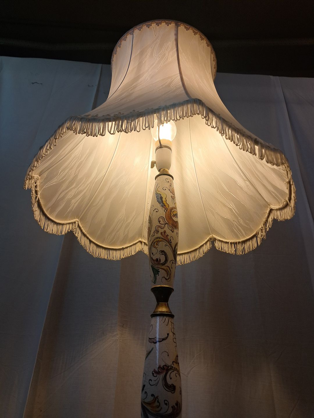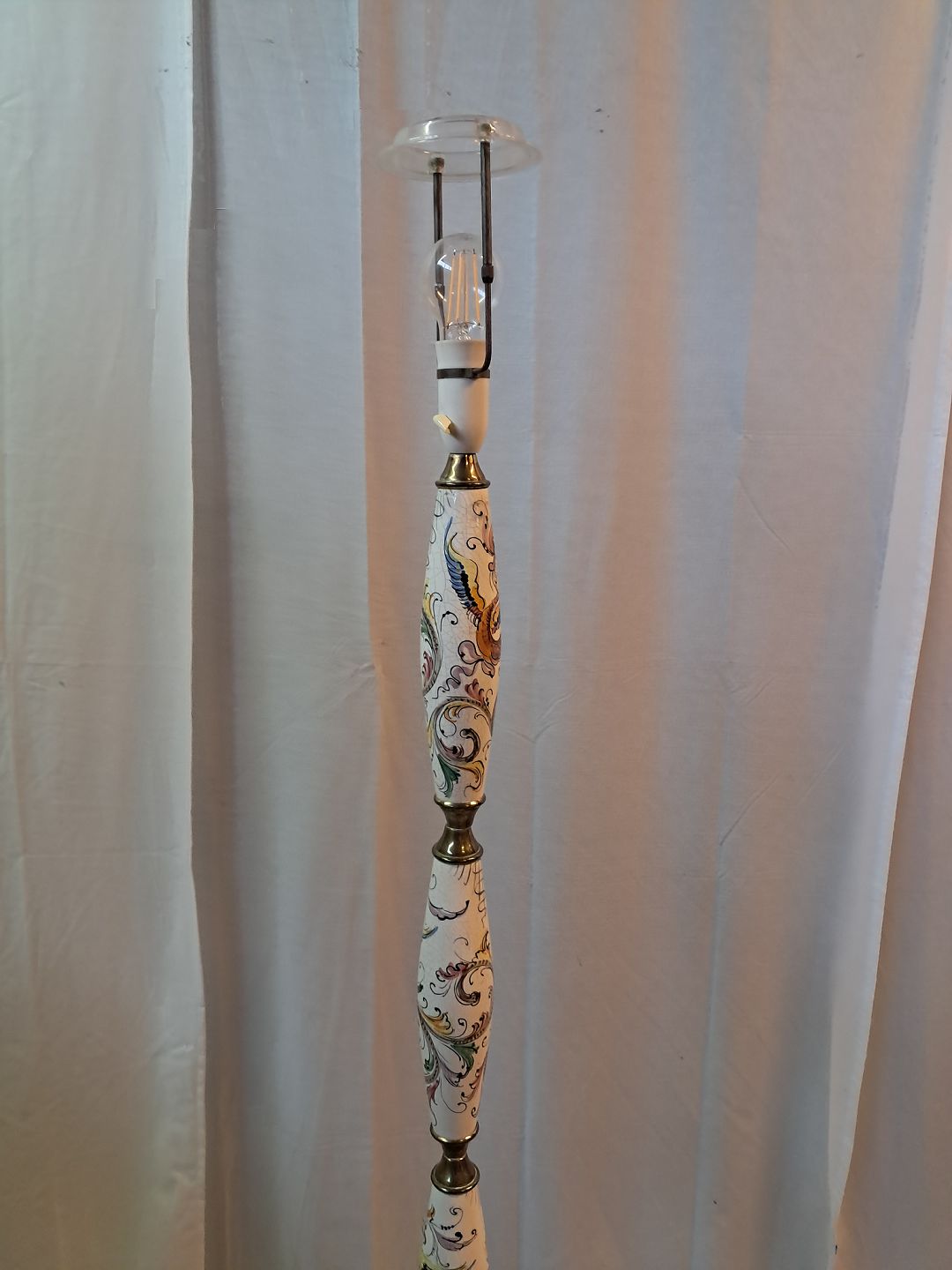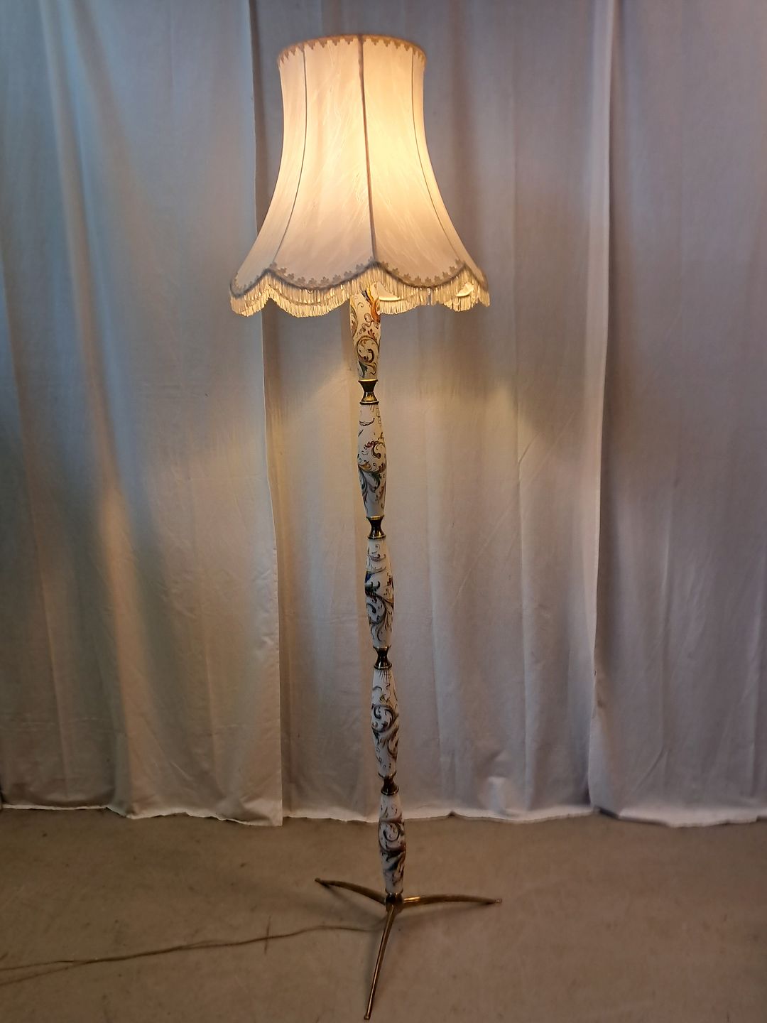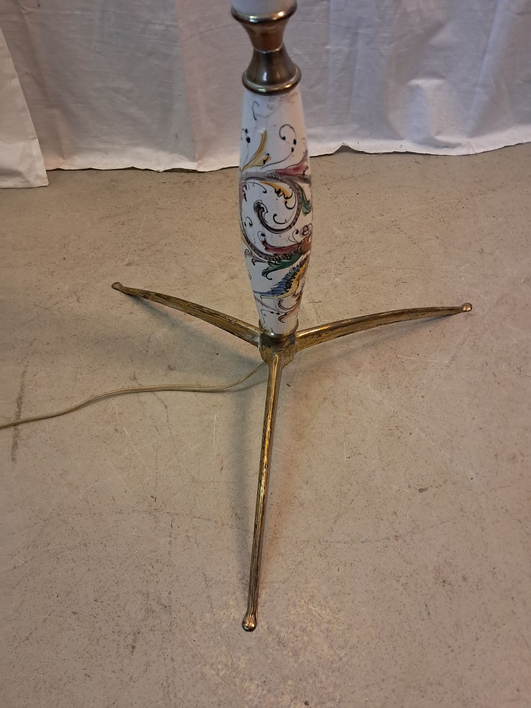 Beskrivelse: Gulvlampe i metal og pocelæn med skærm, fra 1980erne.