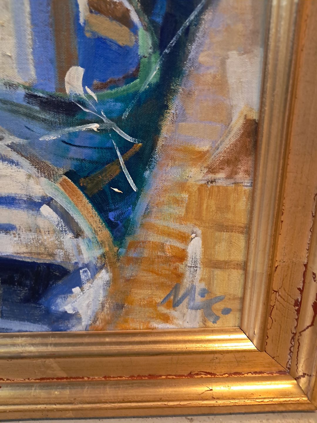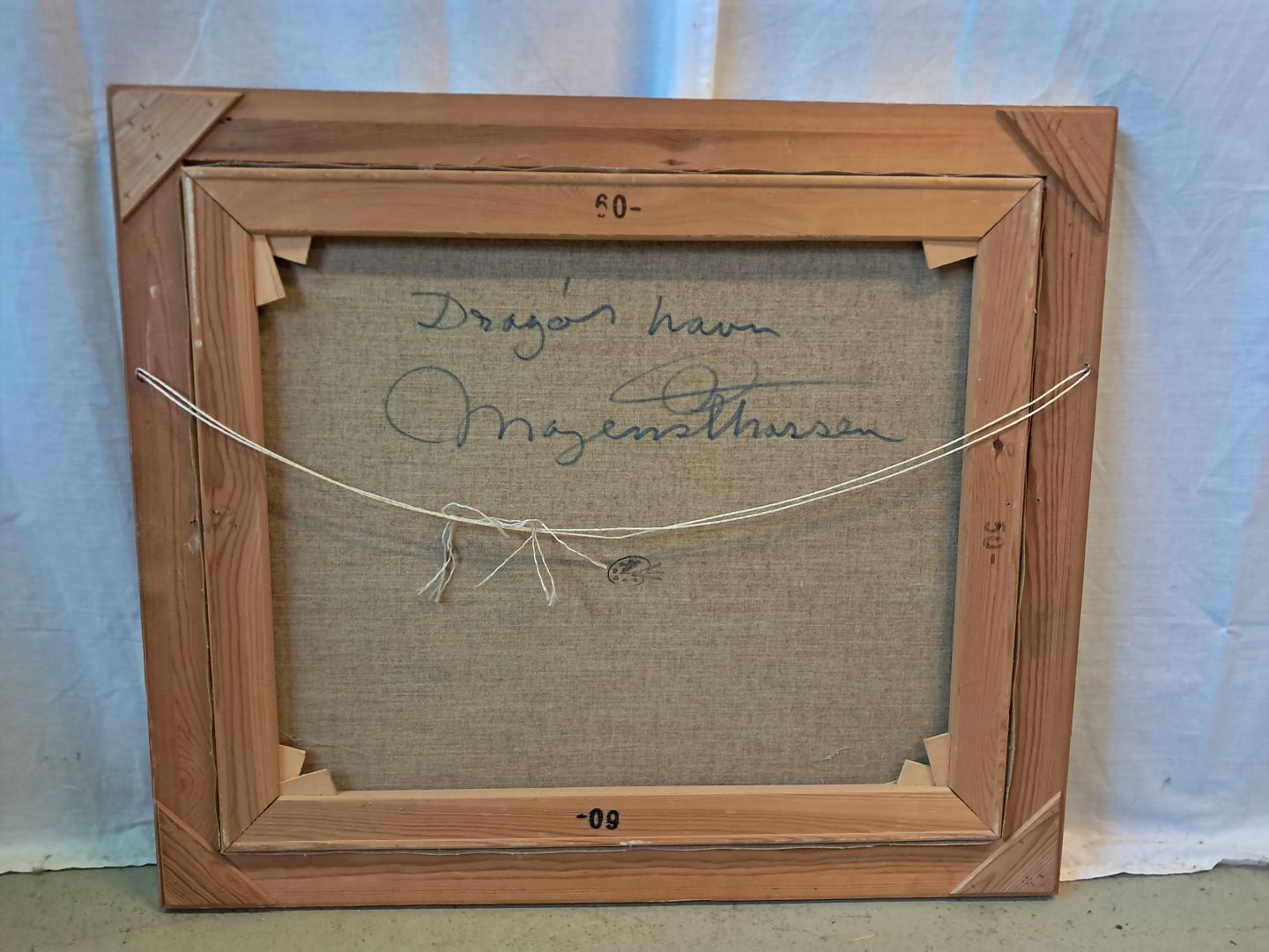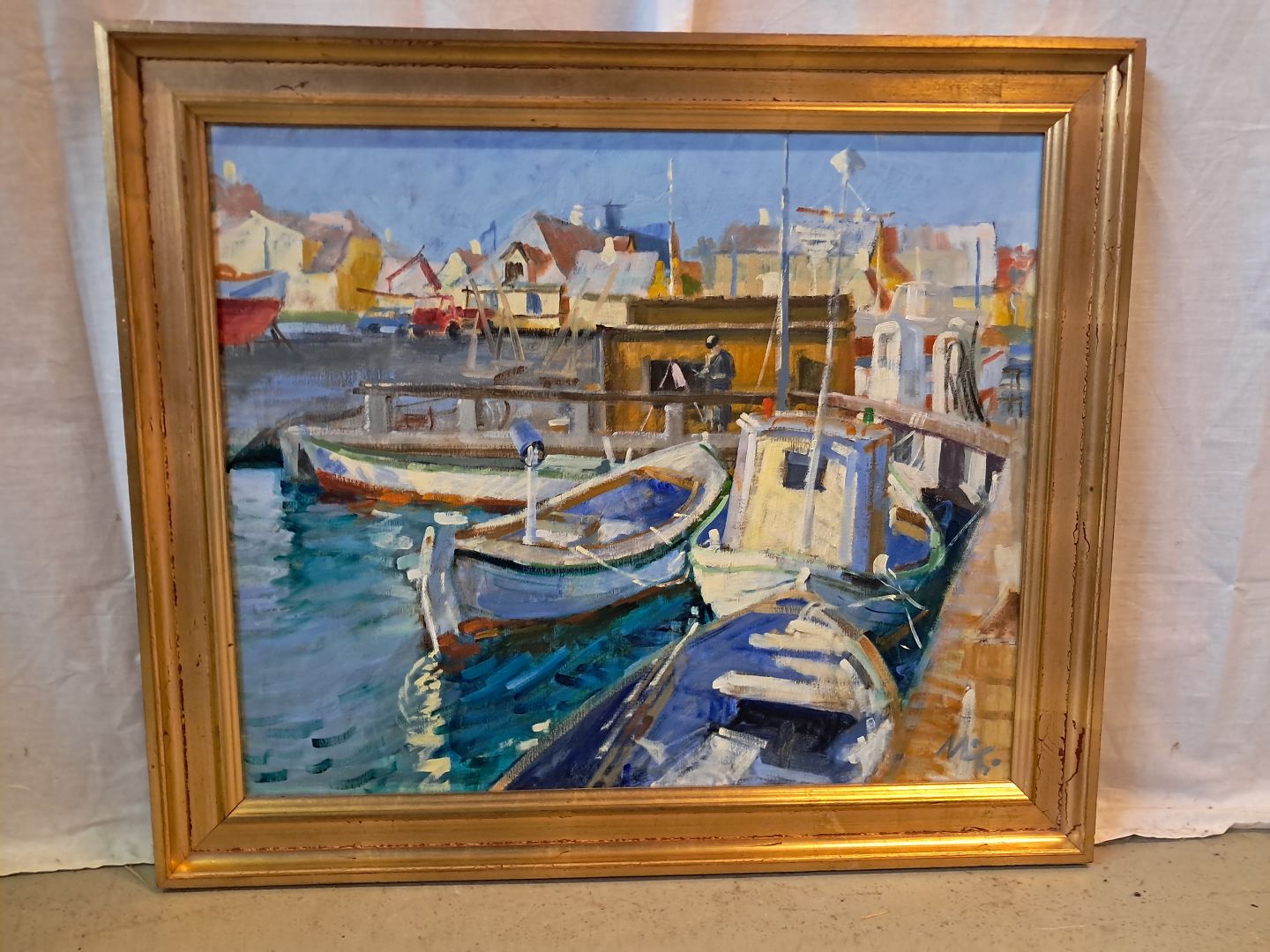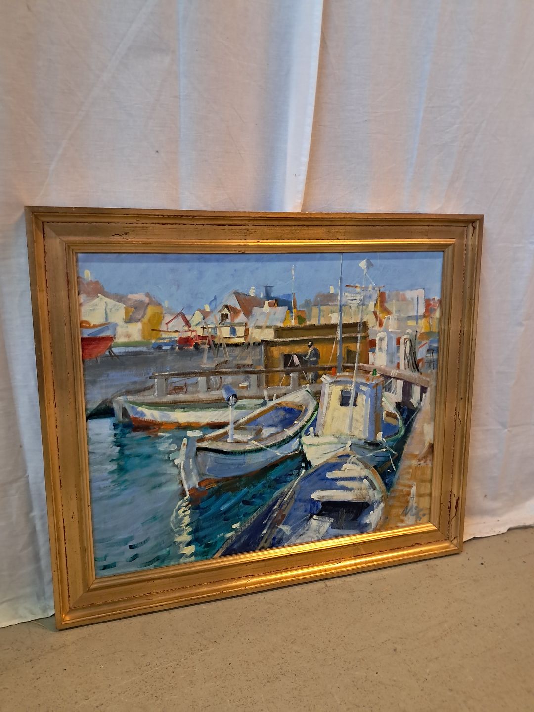 Beskrivelse: Maleri af Dragør havn i guldmalet ramme, af : Mogens Amdi Thorsen (1924-2016)