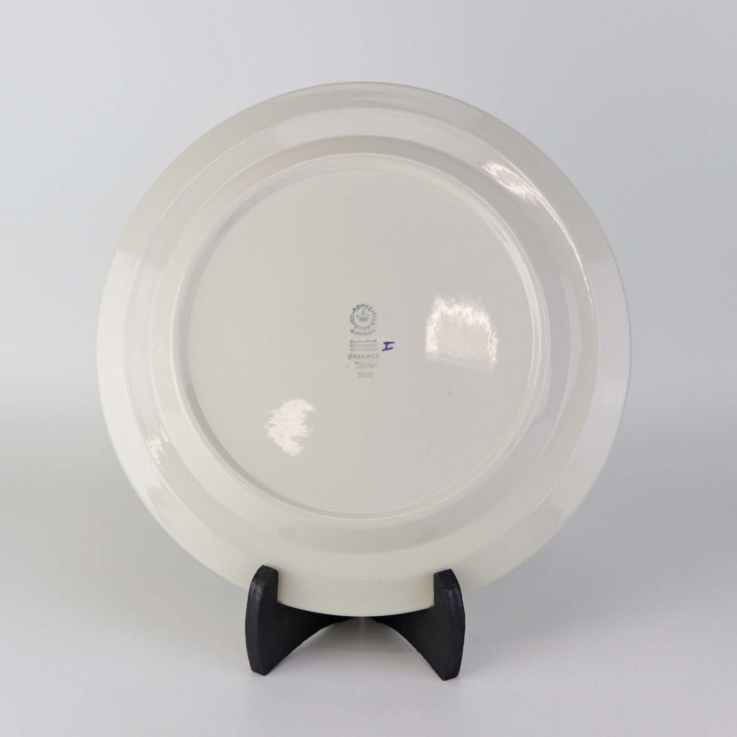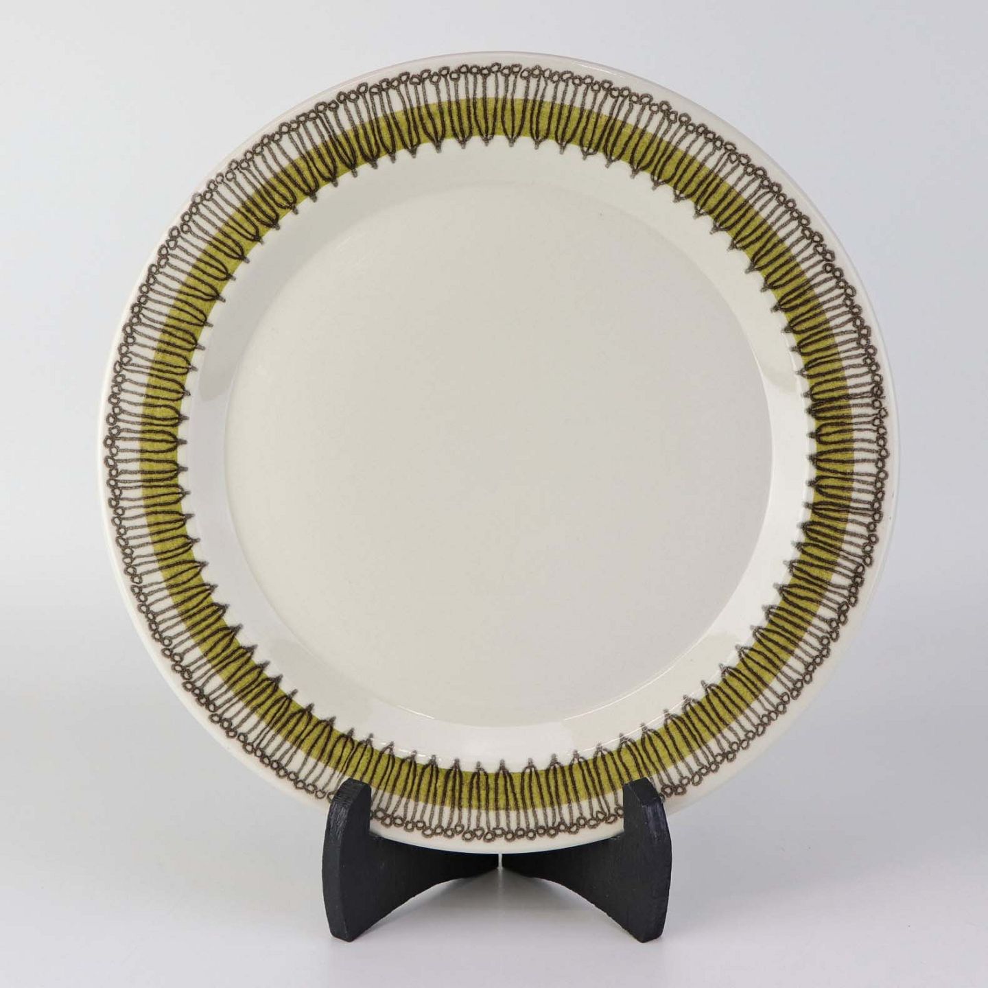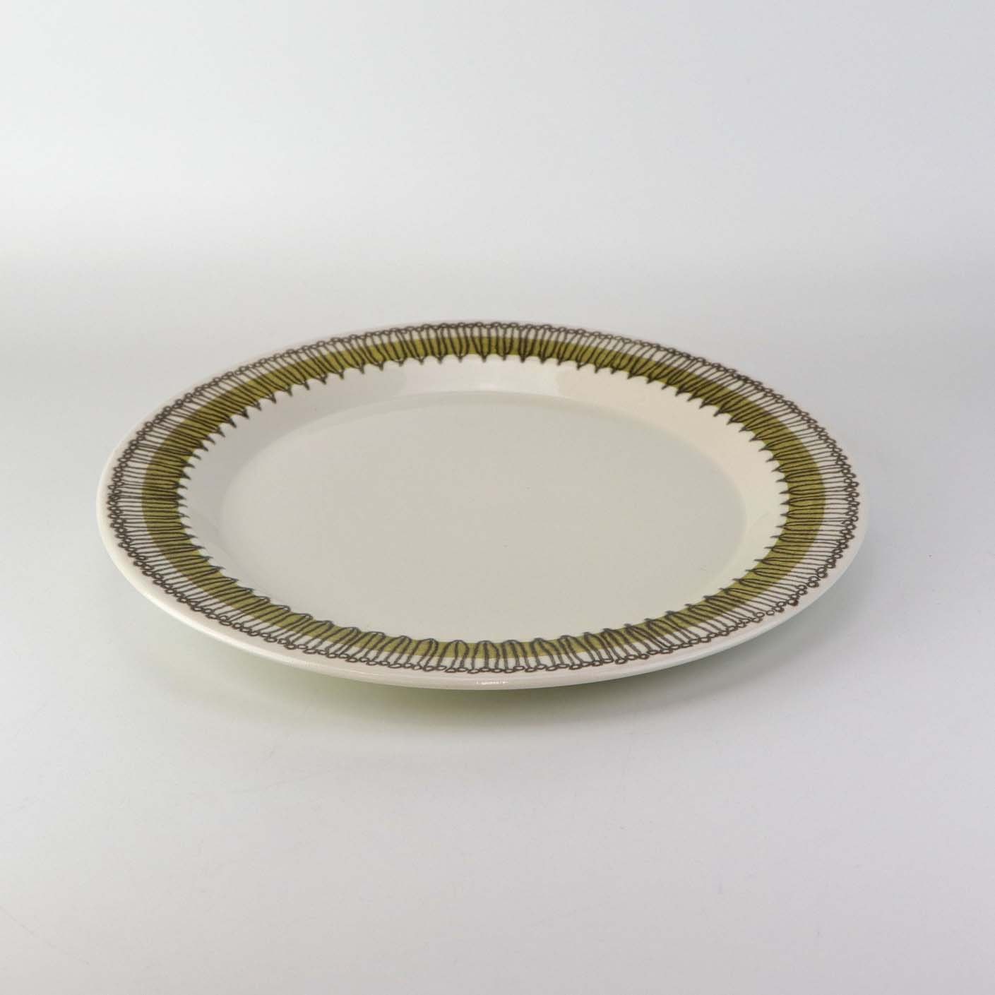 Beskrivelse: Middagstallerken i kongelig fajance fra stellet Grøn Trina. Nr. 3462