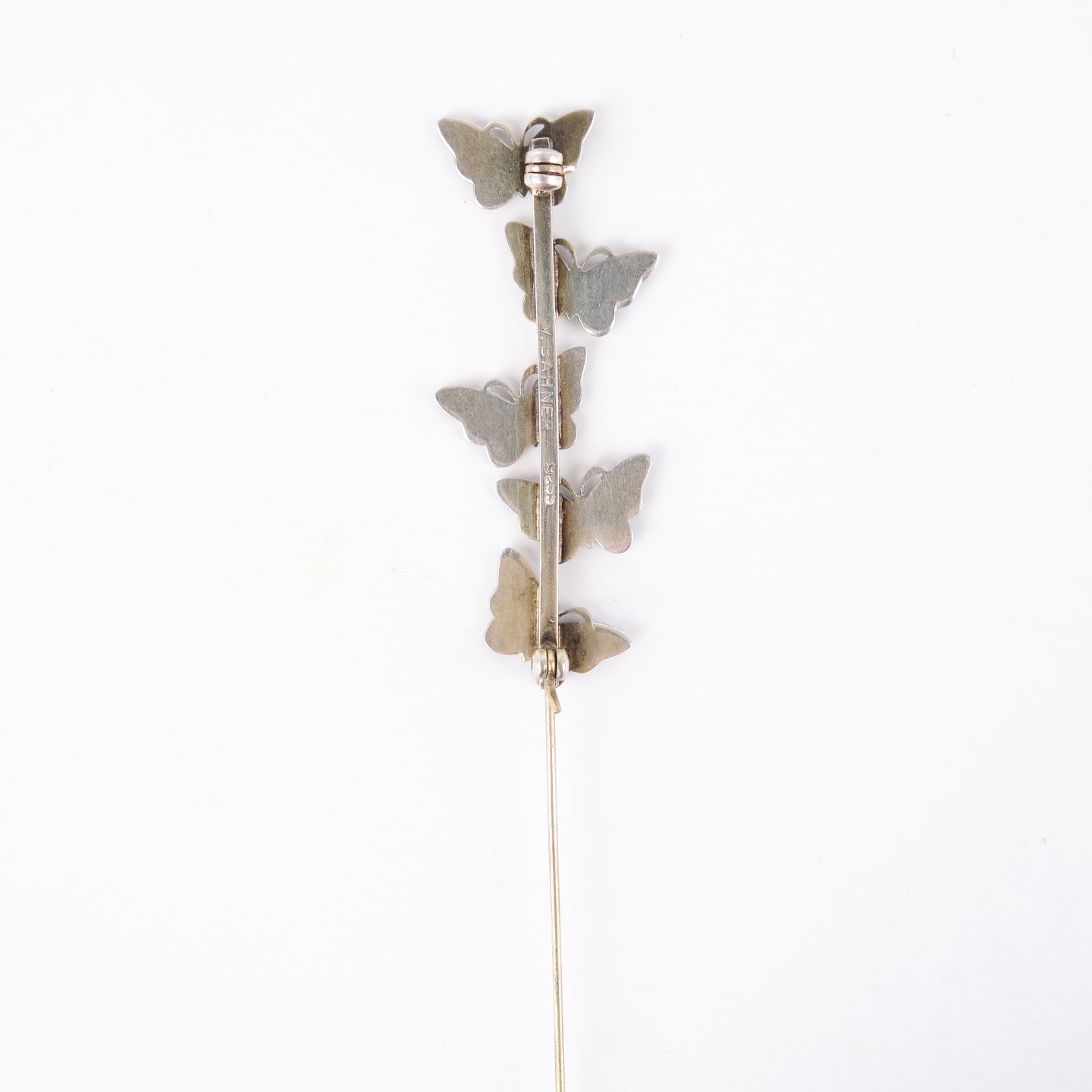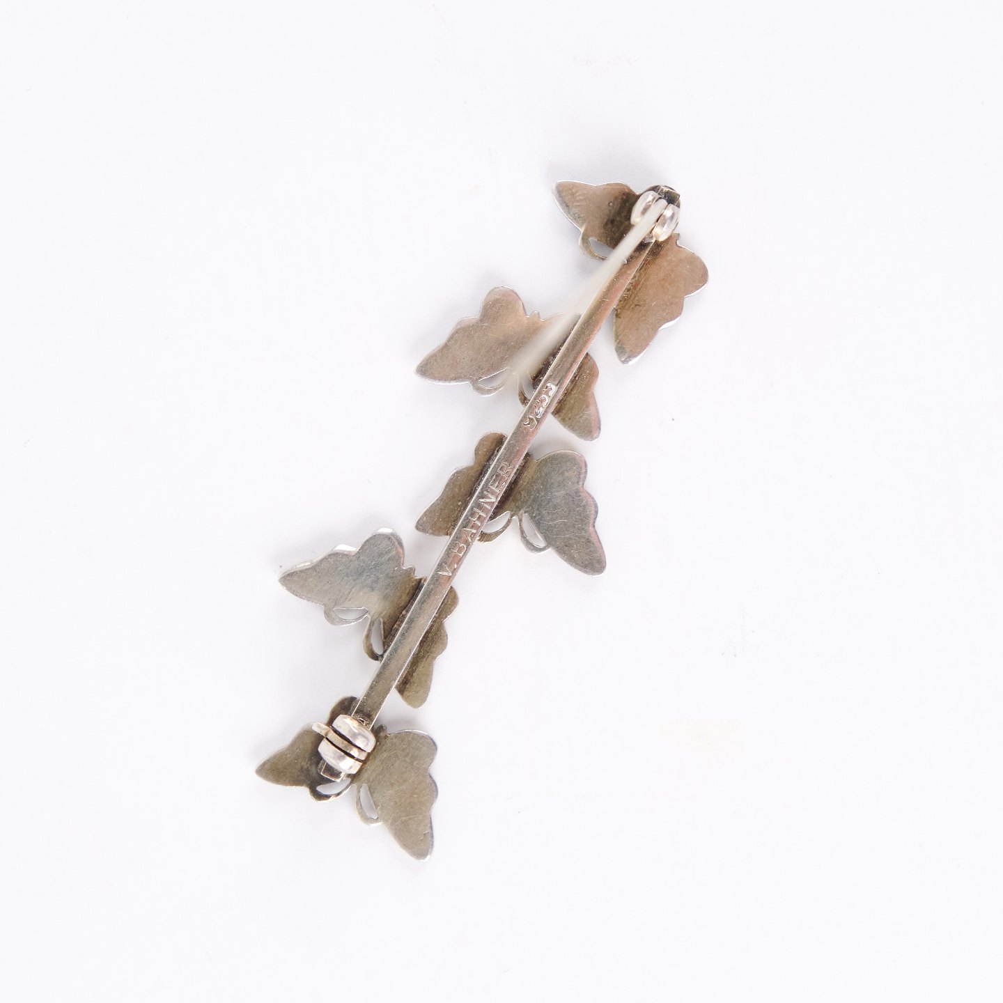 Beskrivelse: Broche med motiv af blå emaljerede sommerfugle, stemplet 925 S og udført hos Volmer Bahner & Co., København (1962–1987). Et dekorativt smykke i sterling sølv med karakteristisk farverig emalje, hel og intakt, kendetegnet ved Bahners særlige formsprog og høje håndværkskvalitet.