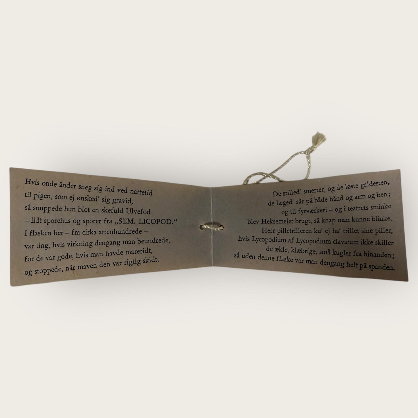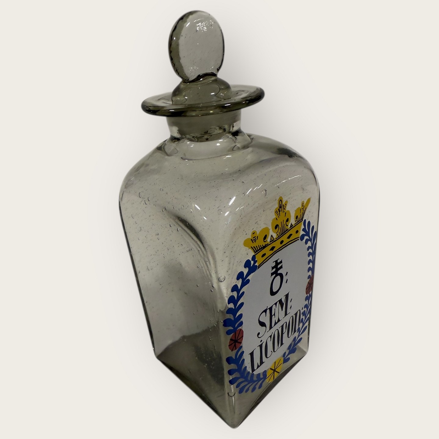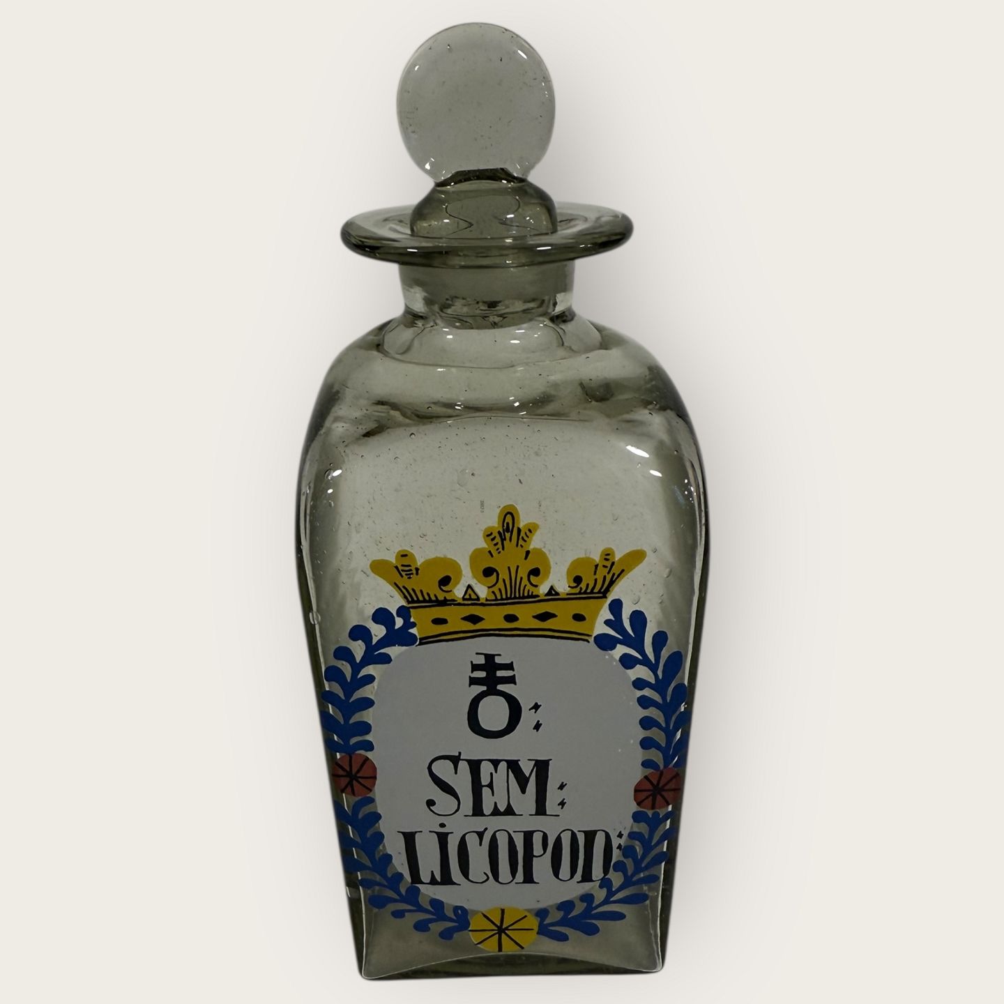 Beskrivelse: Holmegaard apotekerflaske fra 1977, Sem Licopod, Mål: 17,5x6,5x6,5cm, flaskerne er mundblæste kopier af originale gamle apotekerflasker, Signeret Hg.