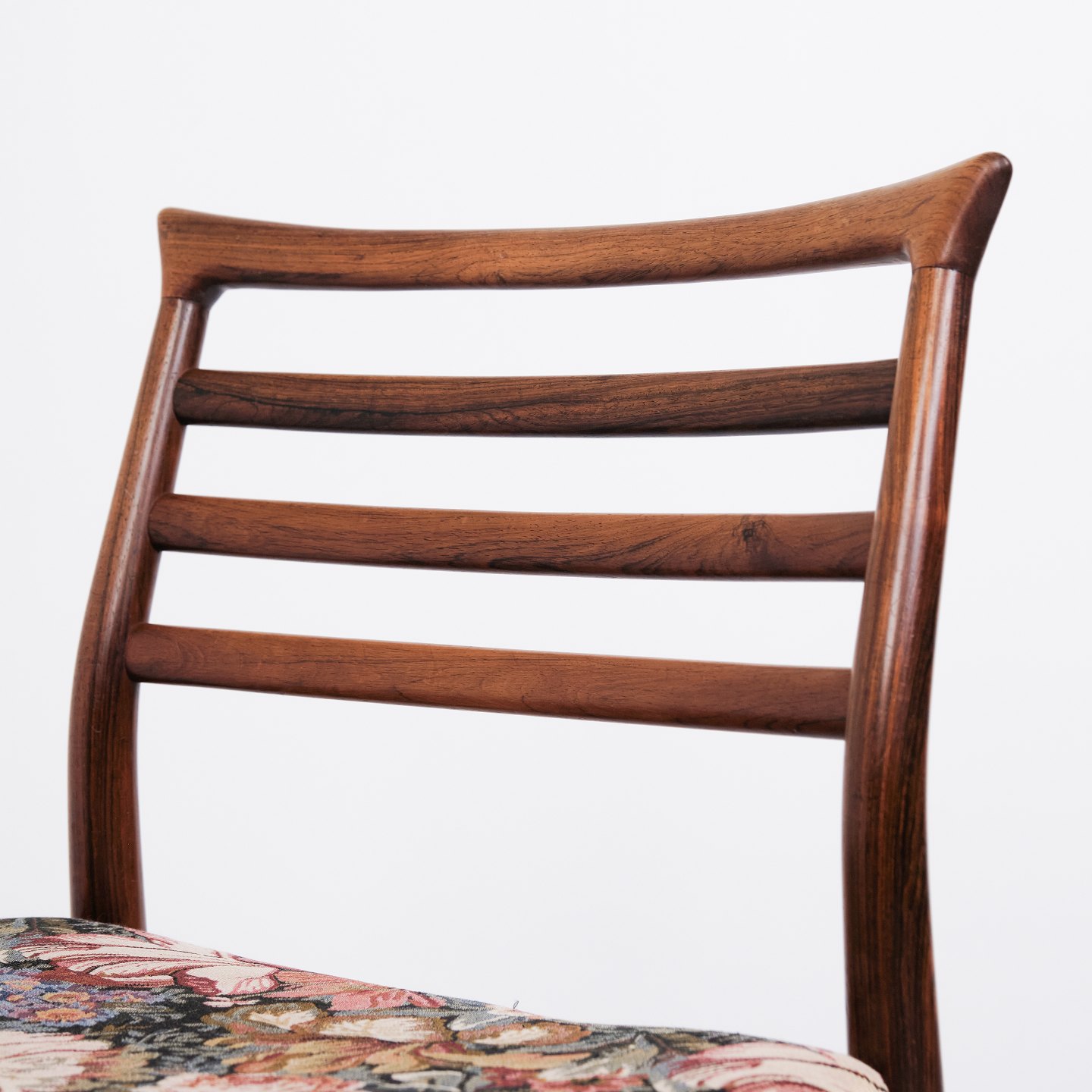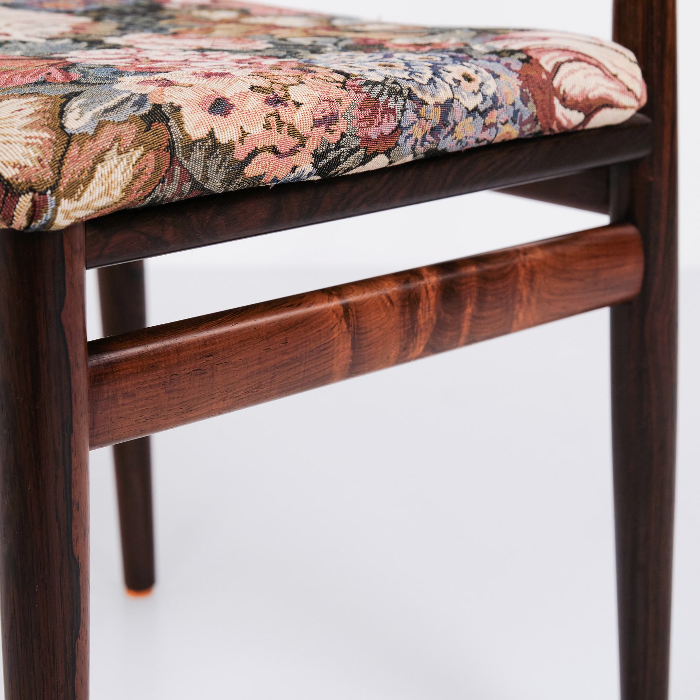 Beskrivelse: Sæt af seks Erling Torvits spisebordsstole fra 1960’erne. Palisander med blomstret sæde. Sorø Møbelfabrik.