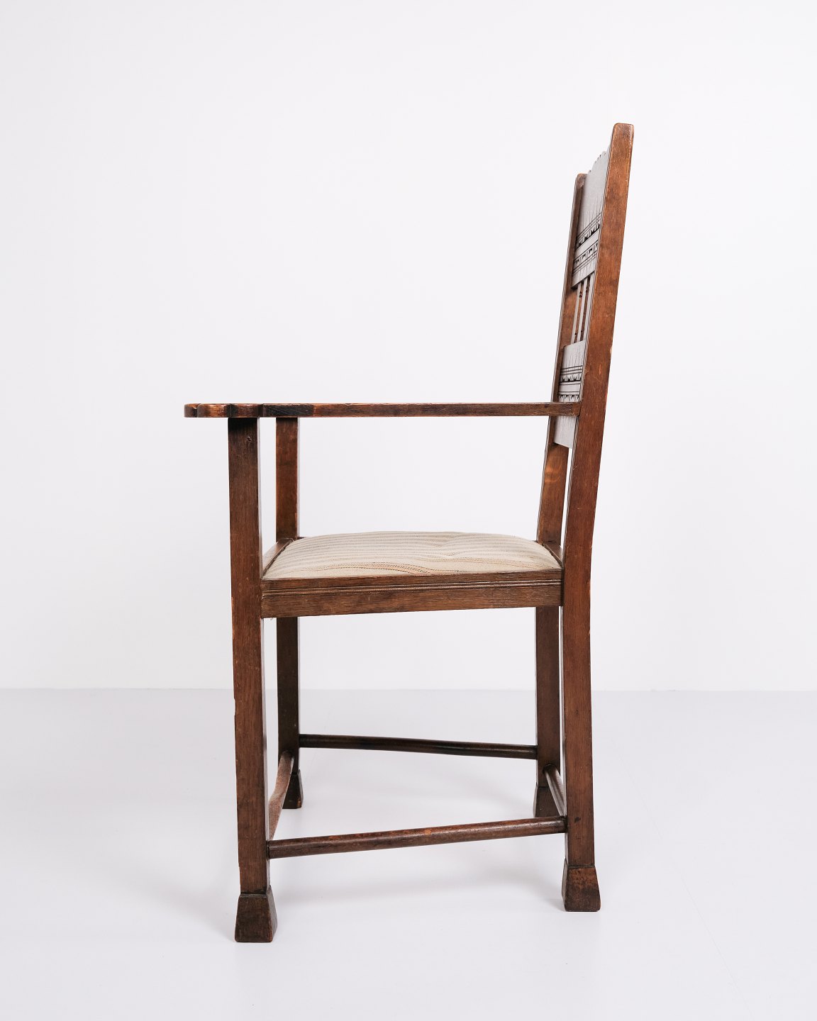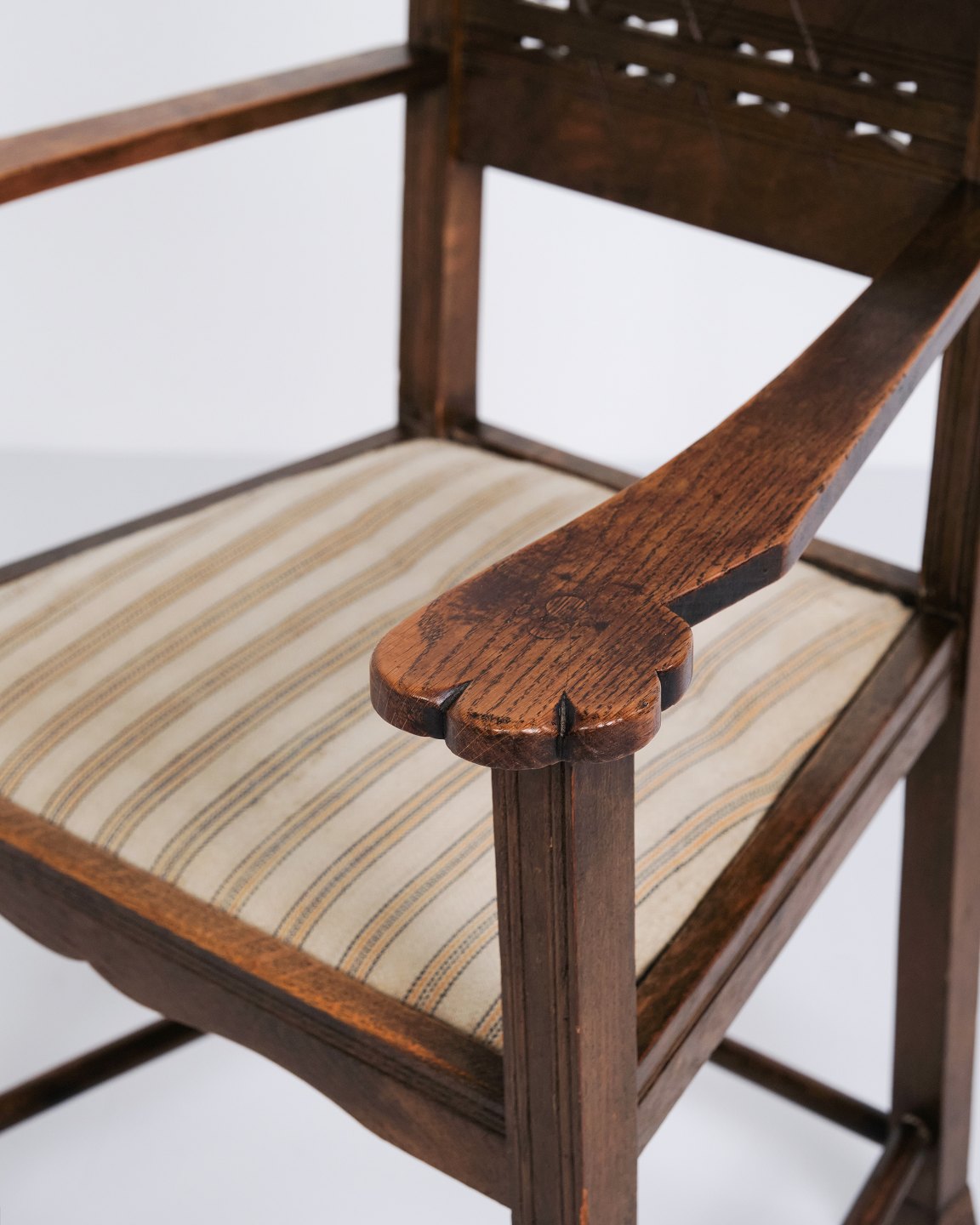 Beskrivelse: Antik armstol i egetræ fra 1930’erne med stribet polstring.