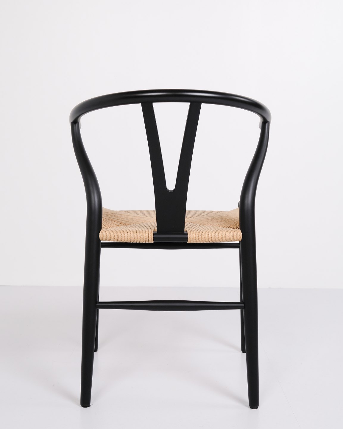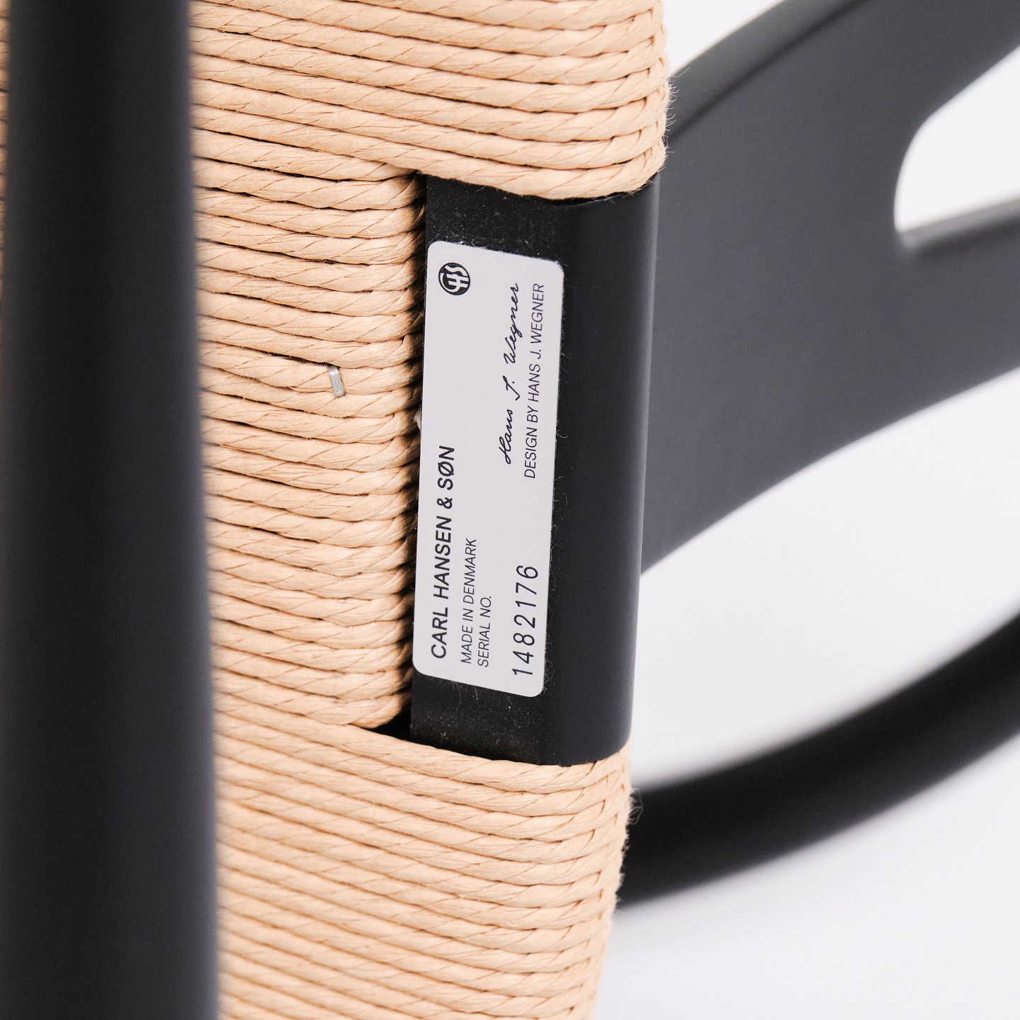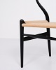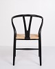 Beskrivelse: Sæt af fire Y-stole, model CH24, designet af Hans J. Wegner og produceret af Carl Hansen & Søn. Stolene er udført i massivt træ, lakeret i Soft Black, og med sæde i flettet naturpapir.