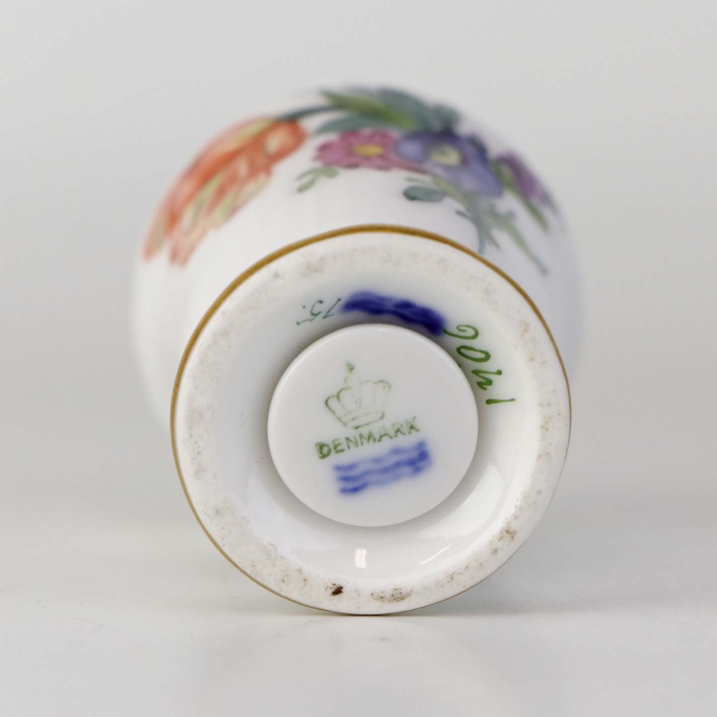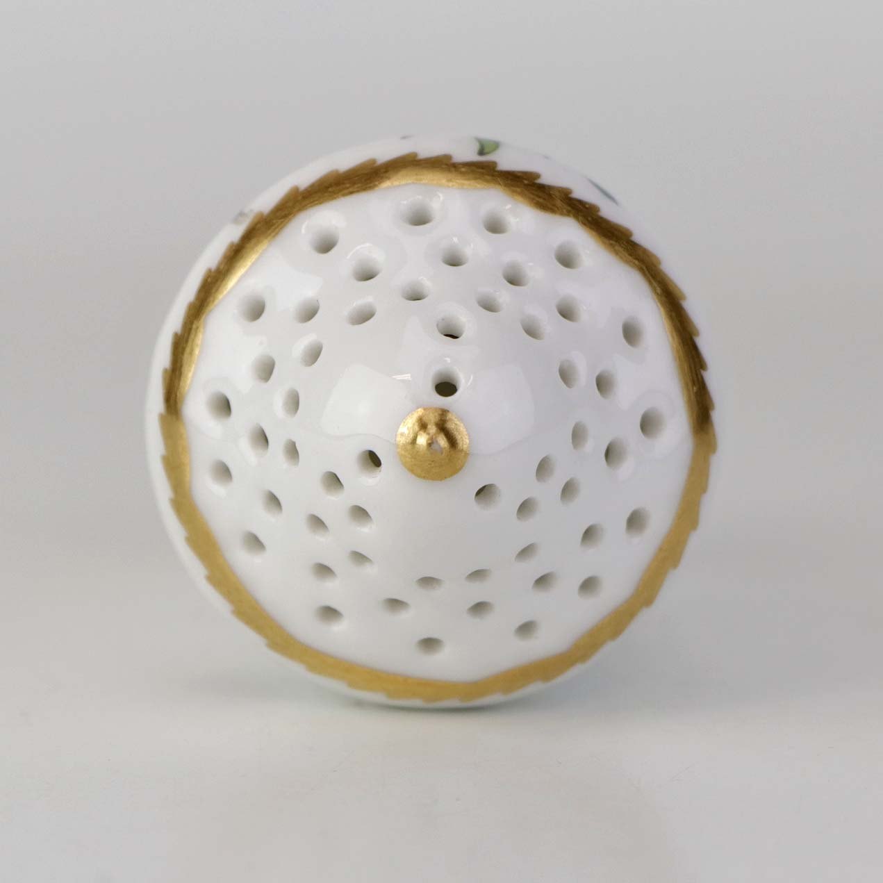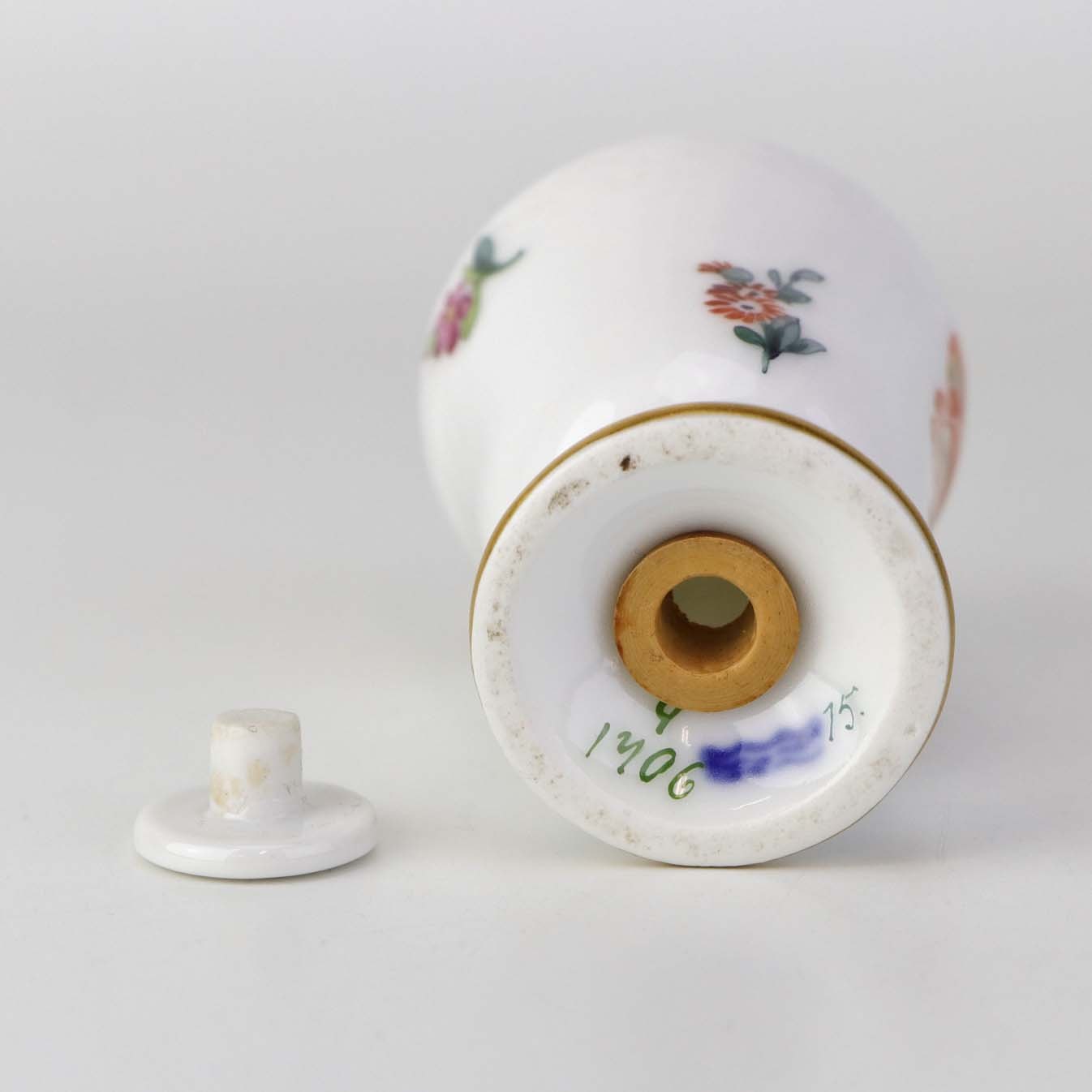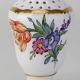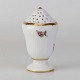 Beskrivelse: Saltbøsse i kongelig porcelæn fra stellet Saksisk Blomst. Strøen har prop i porcelæn. Nr. 1406
