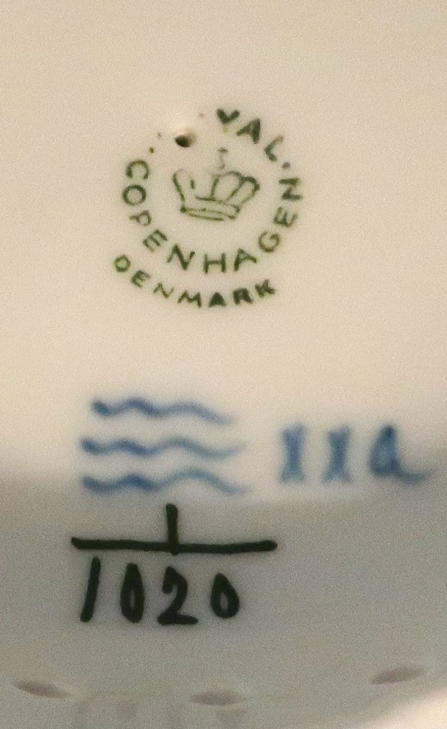 Beskrivelse: Royal Copenhagen. Musselmalet, helblonde. Kageskål på fod. Model 1020. Højde 14,5 cm. Diameter 20,5 cm. (1 sortering)