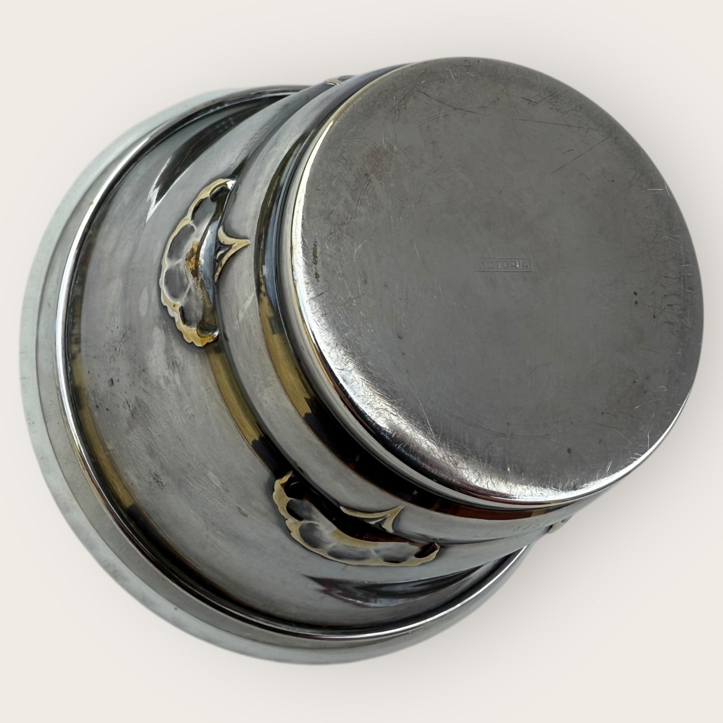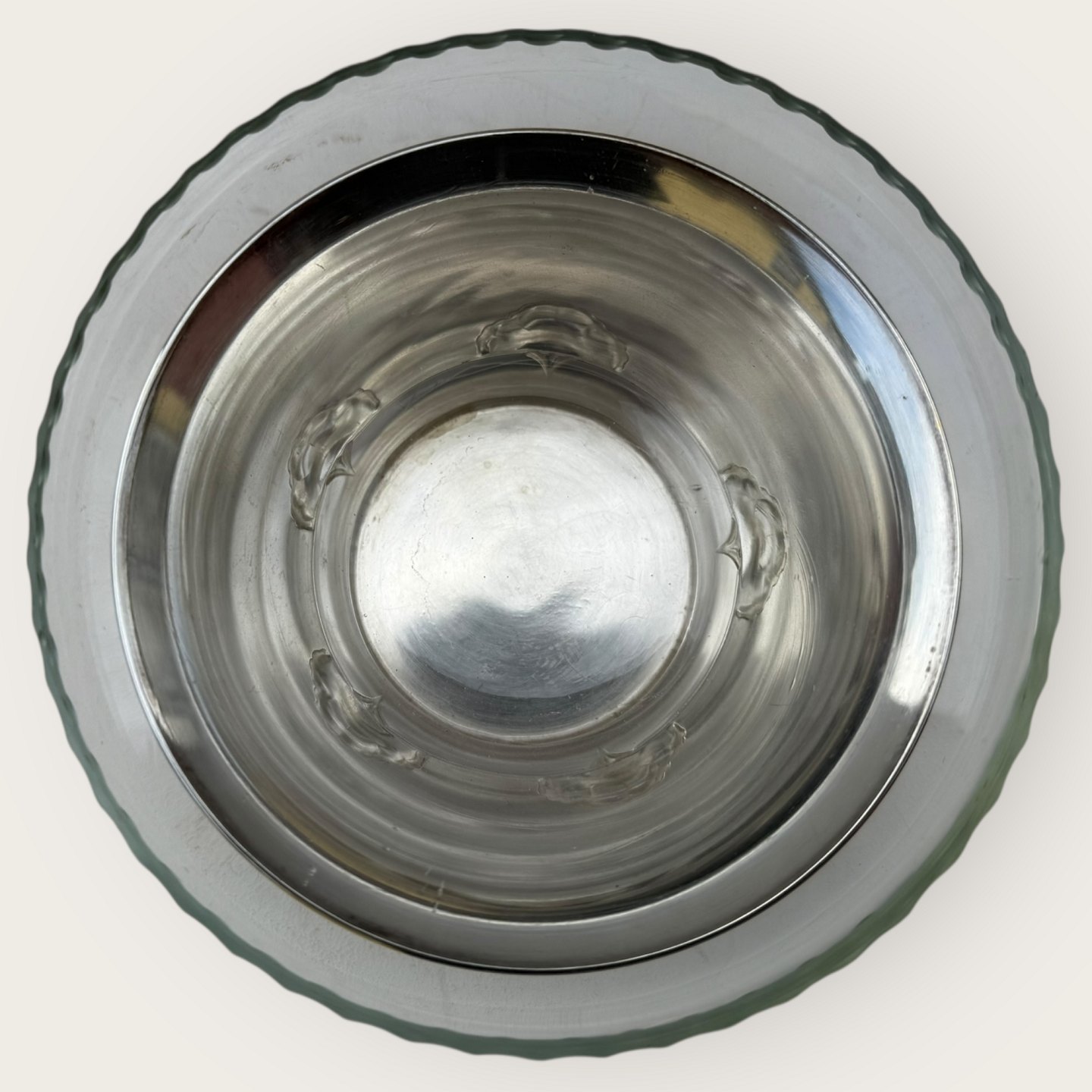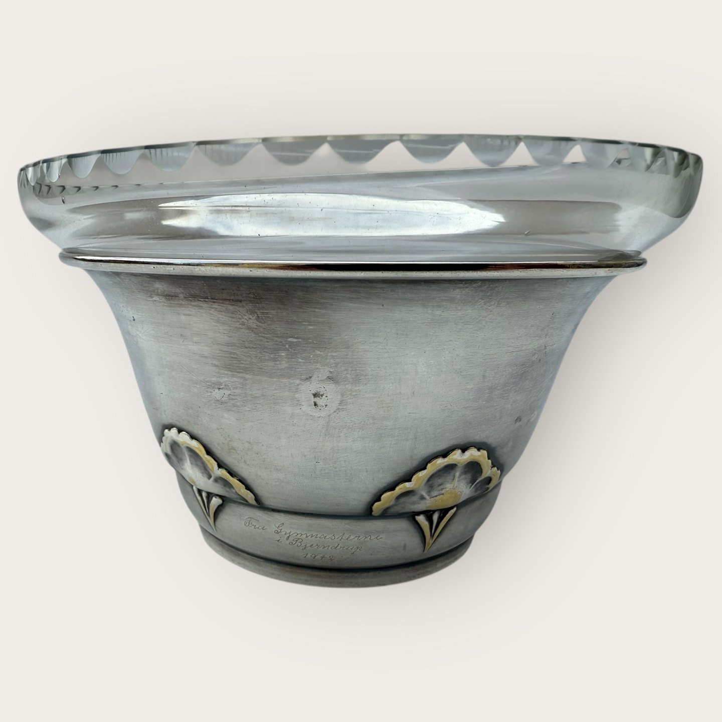 Beskrivelse: Mindre sølvpletskål med glasindsats, højde 8,5cm, diameter 13,8cm, glasindsatsen i fin stand, sølvpletskålen med patina og indgraveret: Fra gymnasterne i Bjerndrup 1942