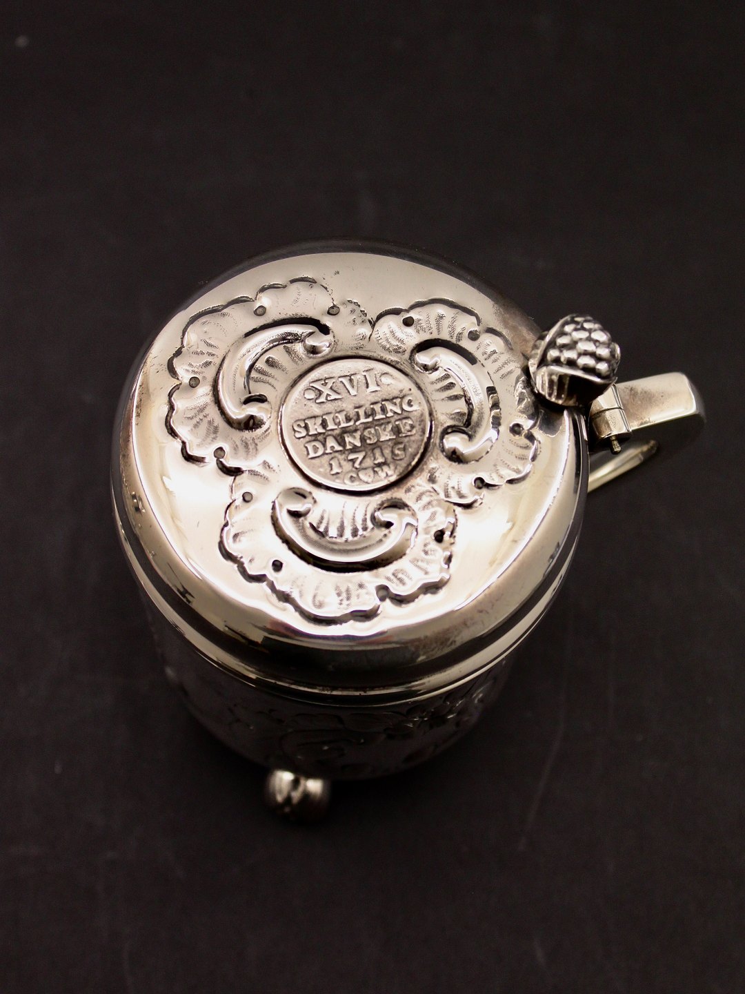 : Tretårnet sølv krus med gammel sølv shilling mønt H. 13 cm. emne nr. 623826
