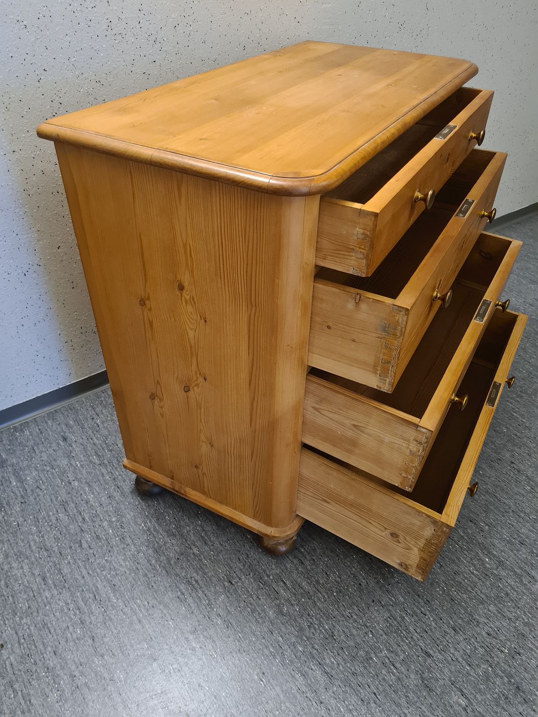 Beskrivelse: Kommode fra 1940'erne I massiv fyrretræ. Fremstår pæn, velholdt og udmærket funktionsdygtig. Dog med ganske få brugsspor på toppen (billede) og umiddelbart uden nøgle.